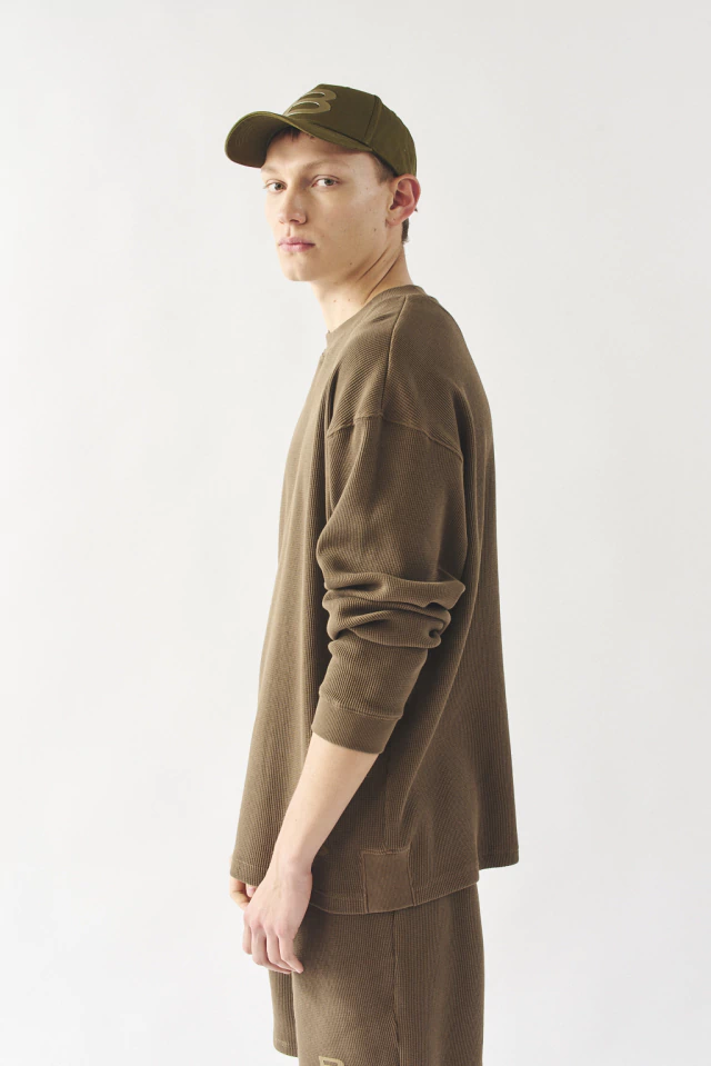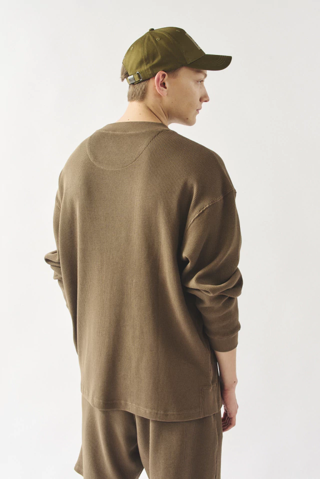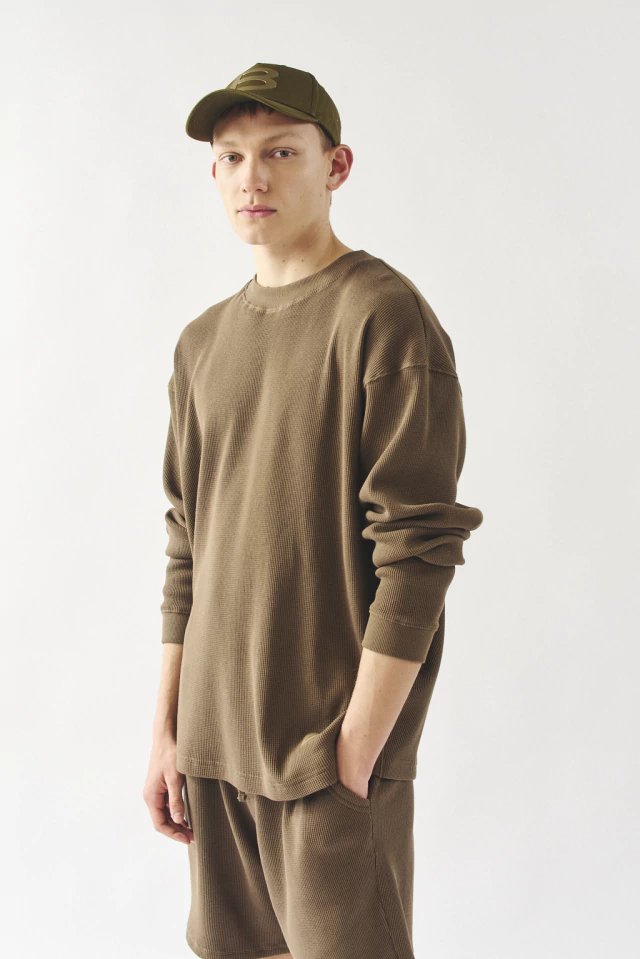 Buzo cuello redondo calce loose. Puños, cuello y recorte lateral de ribb. En tejido waffle algodón.