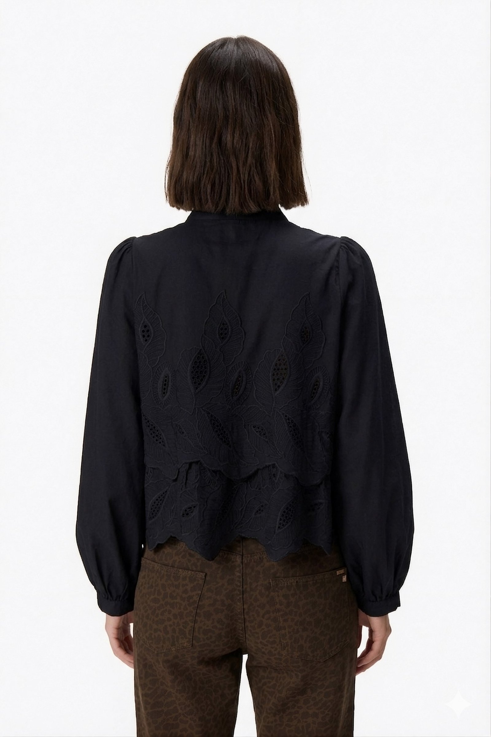 Camisa confeccionada en algodón, con cuello clásico y cierre frontal con botones. Presenta delicado bordado calado en el delantero que aporta textura y un detalle romántico al diseño. Mangas largas con leve volumen y puños abotonados. Ideal para looks sofisticados y femeninos. 100% algodón.
