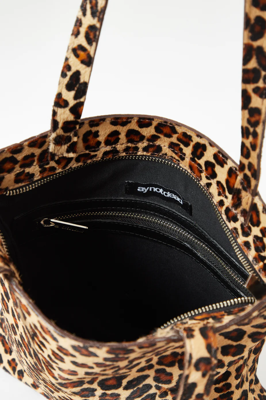 Cartera realizada en cuero vacuno con pelo Animal print. De forma rectangular, con manijas de cuero base para colgar en un hombro y acceso mediante cierre metálico. Lleva logo bordado en el delantero y bolsillo interno con cierre.