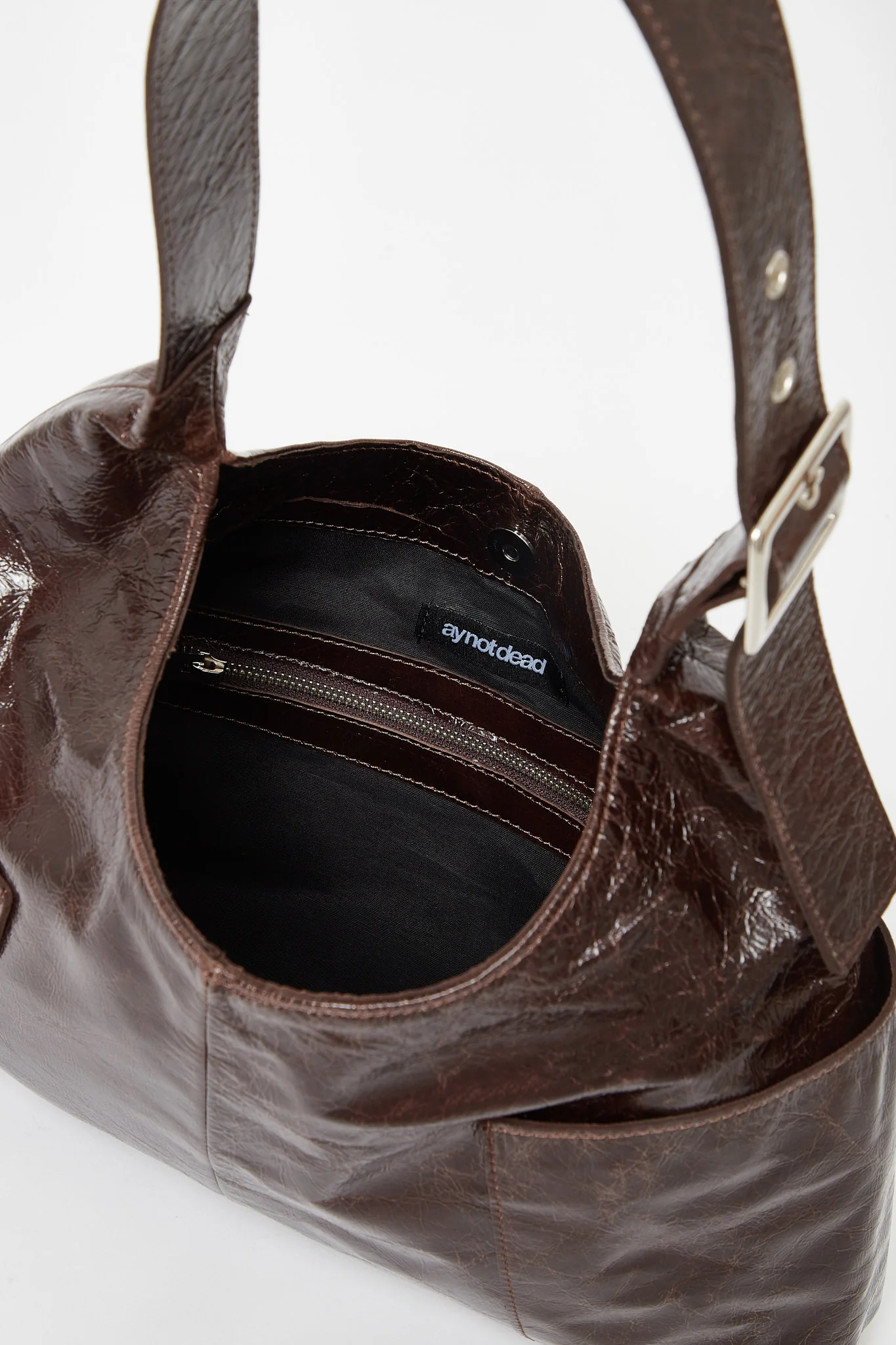 Cartera realizada en cuero vacuno brillante con efecto craquelado, con bolsillos en delantero y trasero. Manija con hebilla y ojalillos metálicos para regular su largo y colgar en un hombro. De forma rectangular, con acceso mediante broche imán interno. Posee logo grabado en bajo relieve en el delantero y bolsillo interno con cierre.