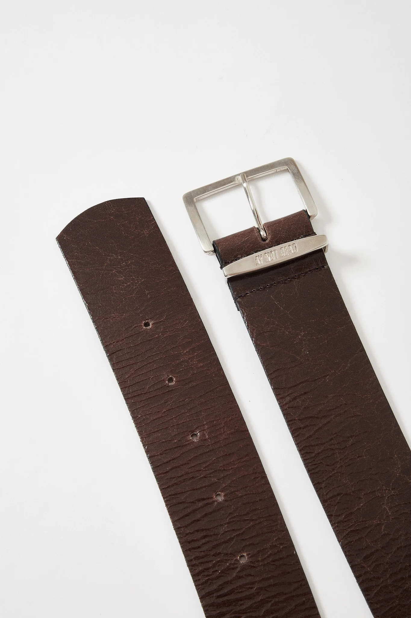 Cinturón de cuero vacuno brillante con efecto craquelado. Hebilla y pasador metalico personalizado con logo Ay not dead. Posee 8 orificios para regular su largo.
