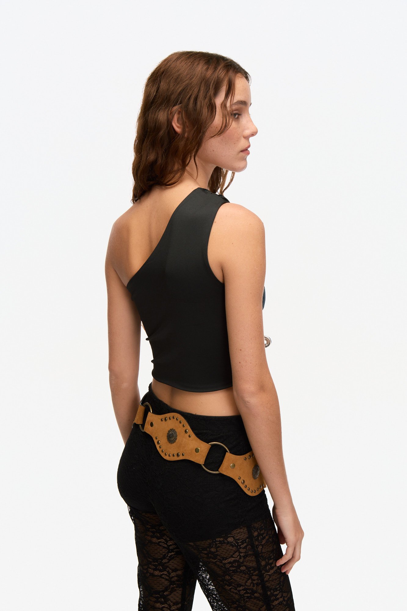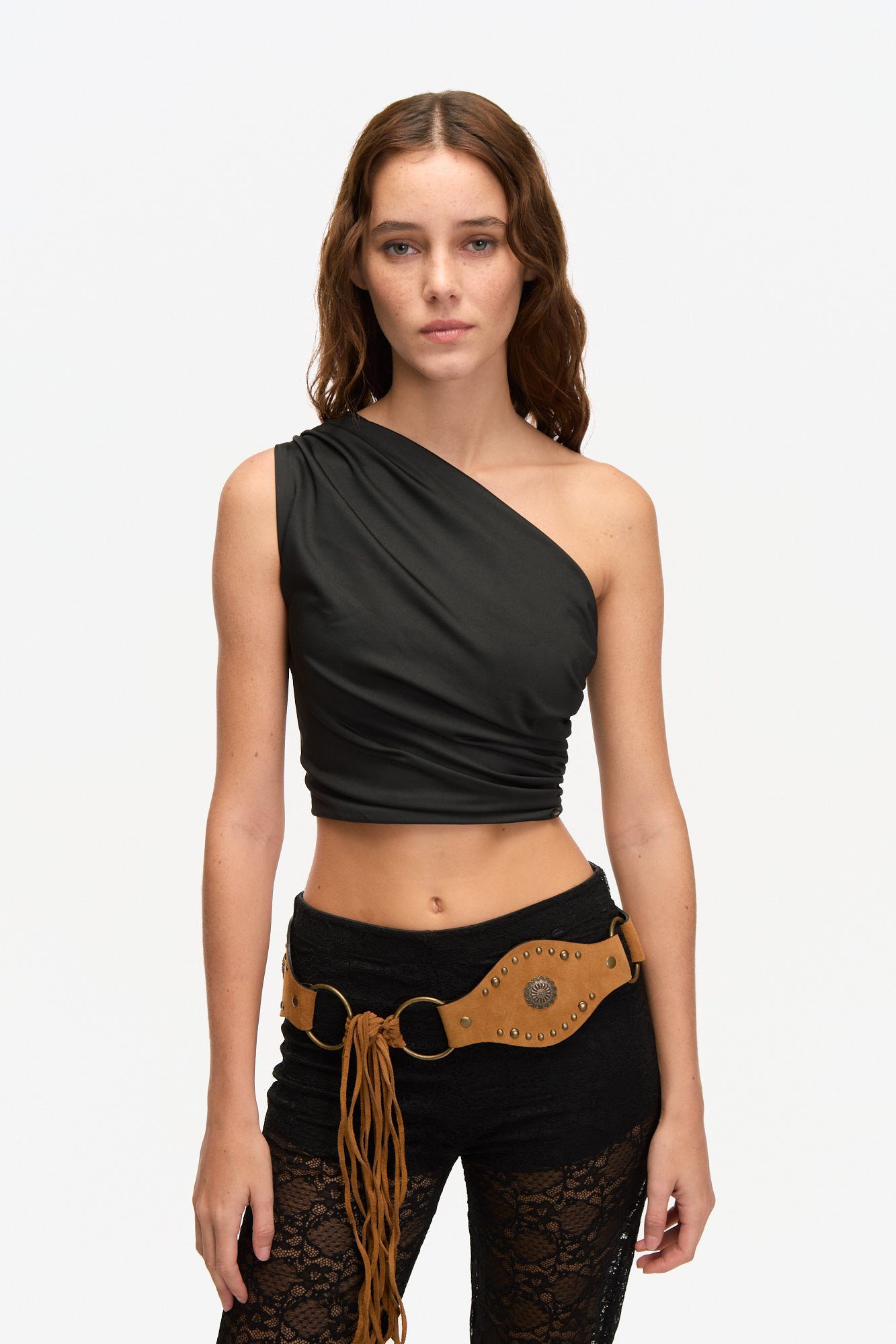 CINTURÓN ANCHO CON DETALLE DE FLECOS LATERALES. DISEÑO CON APLIQUES METÁLICOS Y HEBILLA CIRCULAR AL FRENTE. TERMINACIONES CURVAS Y AJUSTE POSTERIOR CON TIRAS.