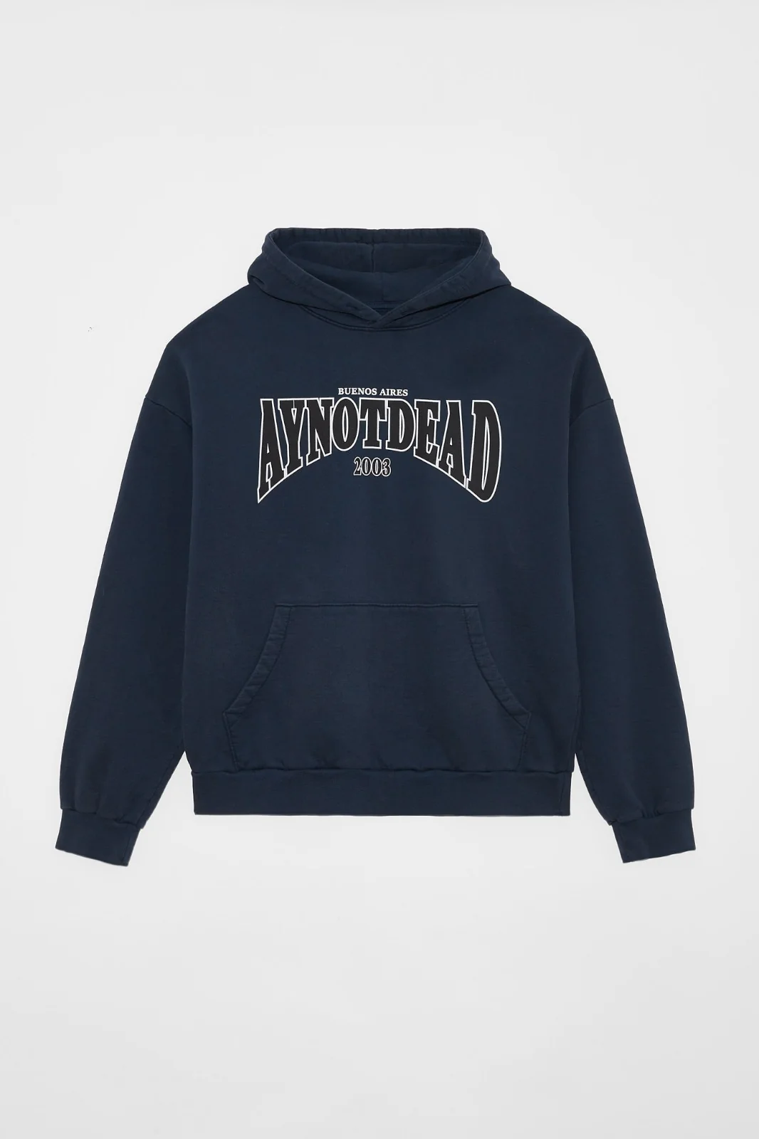 Buzo con capucha y bolsillo canguro. De calce oversize en frisa de algodón con puños en complemento. Teñido en prenda. Estampa logo college ´AY NOT DEAD´en delantero.