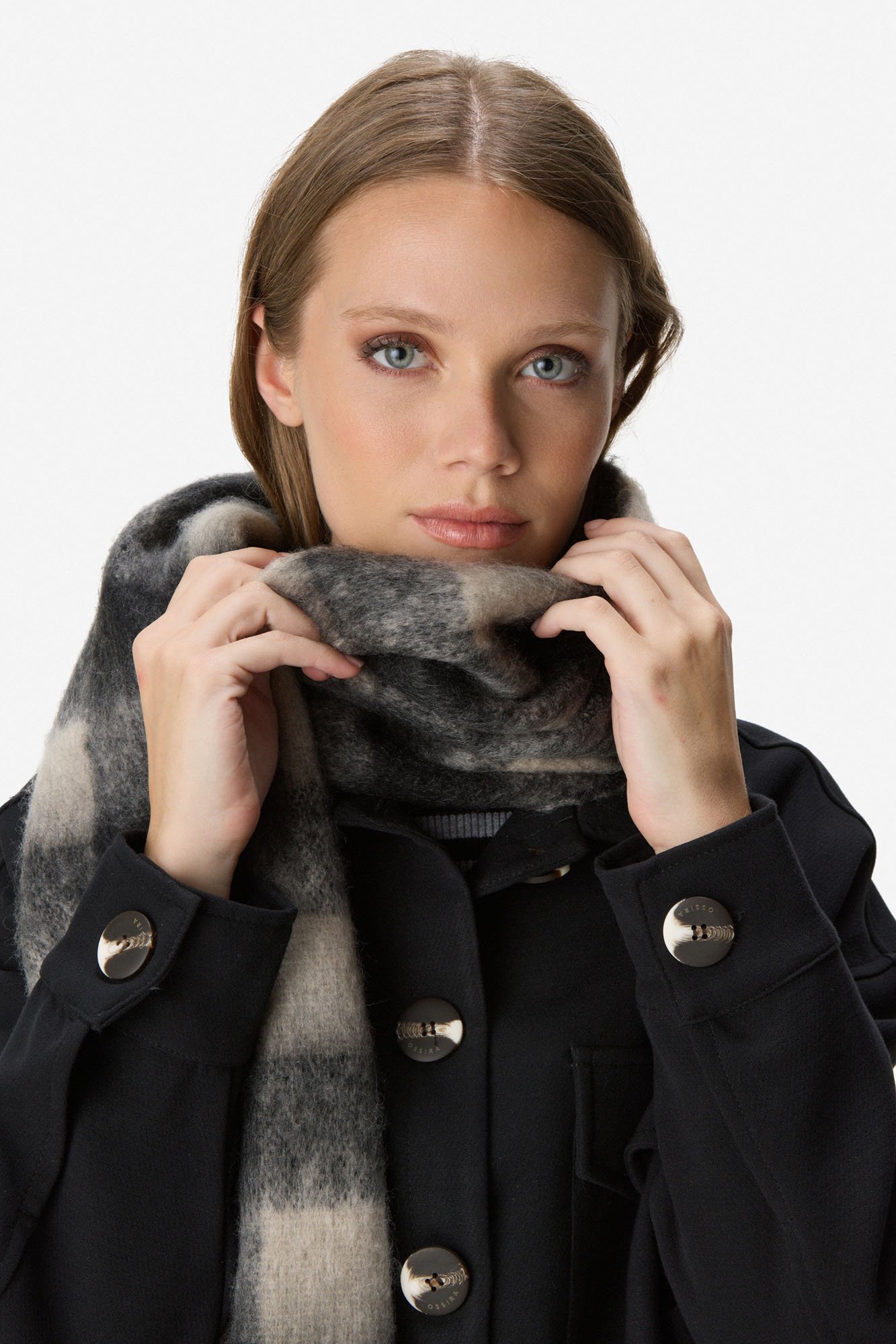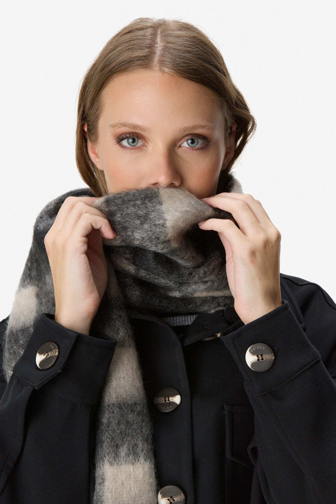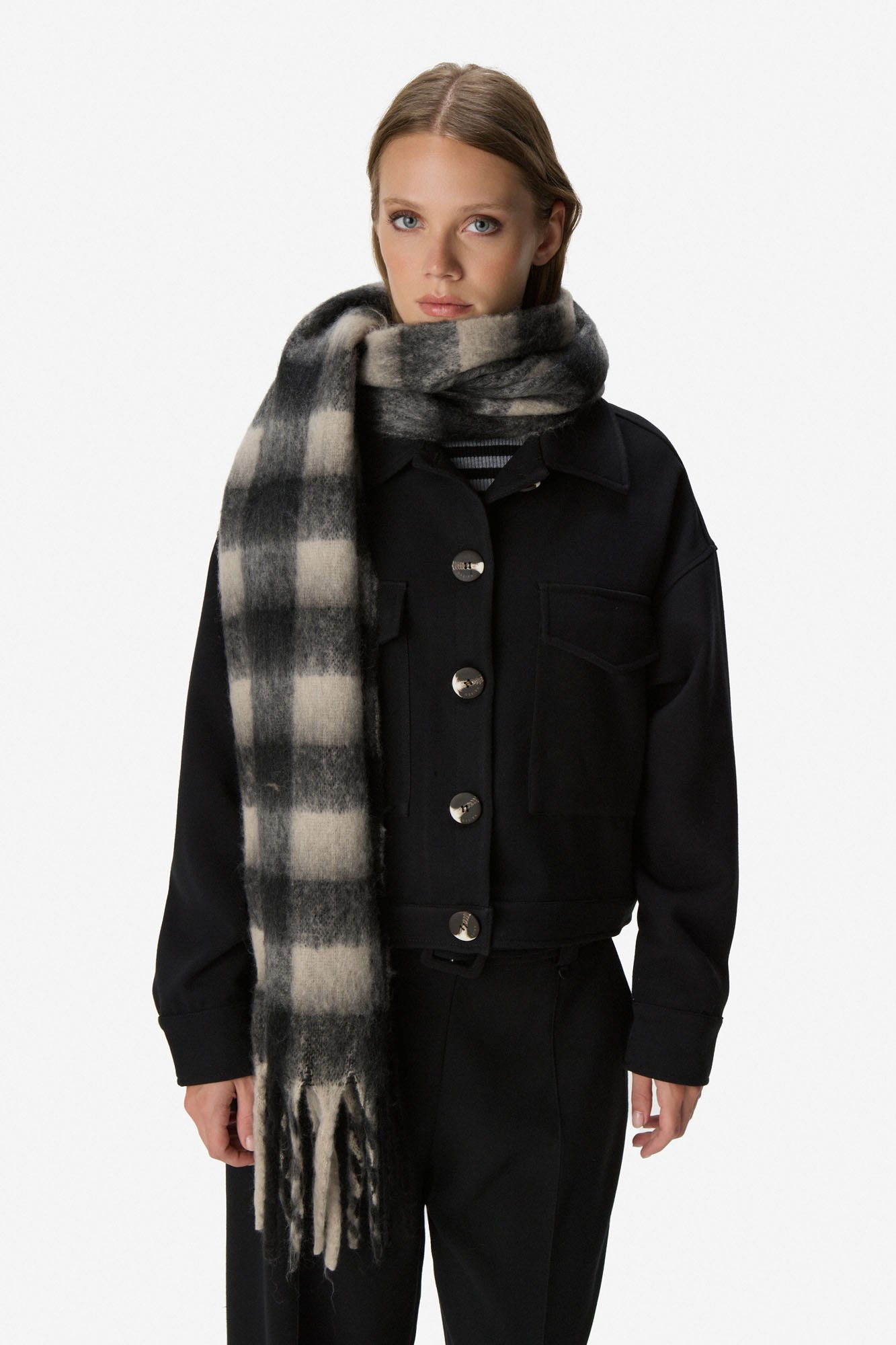 Bufanda de poliéster en formato amplio. Estampa cuadrille con meticuloso detalle y alto nivel de resolución, que aporta carácter y sofisticación. Terminaciones desflecadas. 100% poliéster.