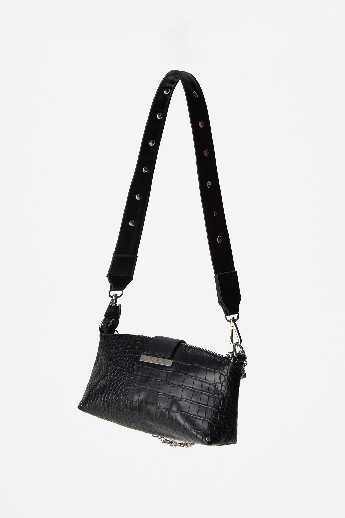 100% PUCartera mini confeccionada en material con textura grabada. Correa larga regulable y cadena metálica desmontable. Acceso superior con cierre. Interior forrado con bolsillo interno. 100% PU.