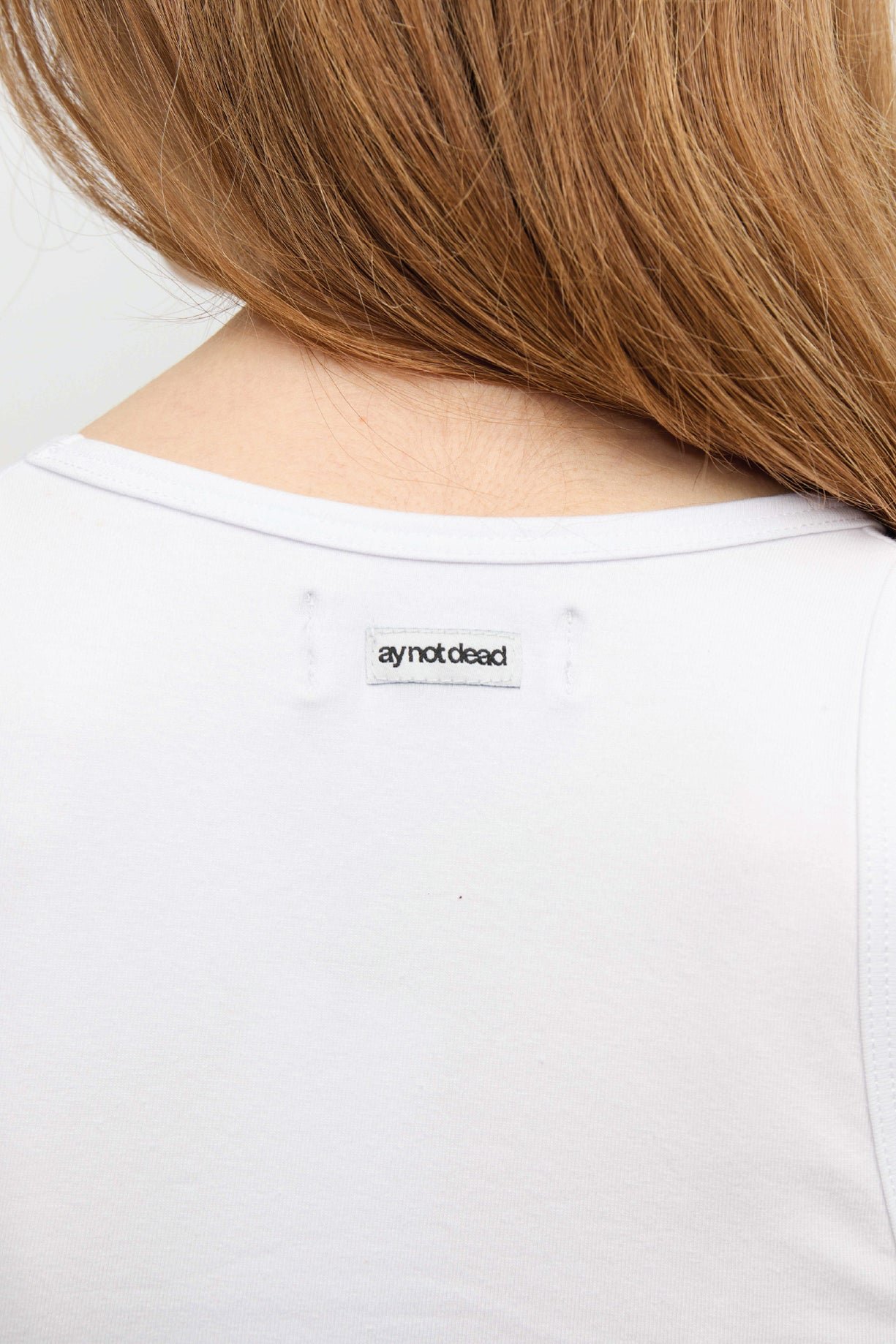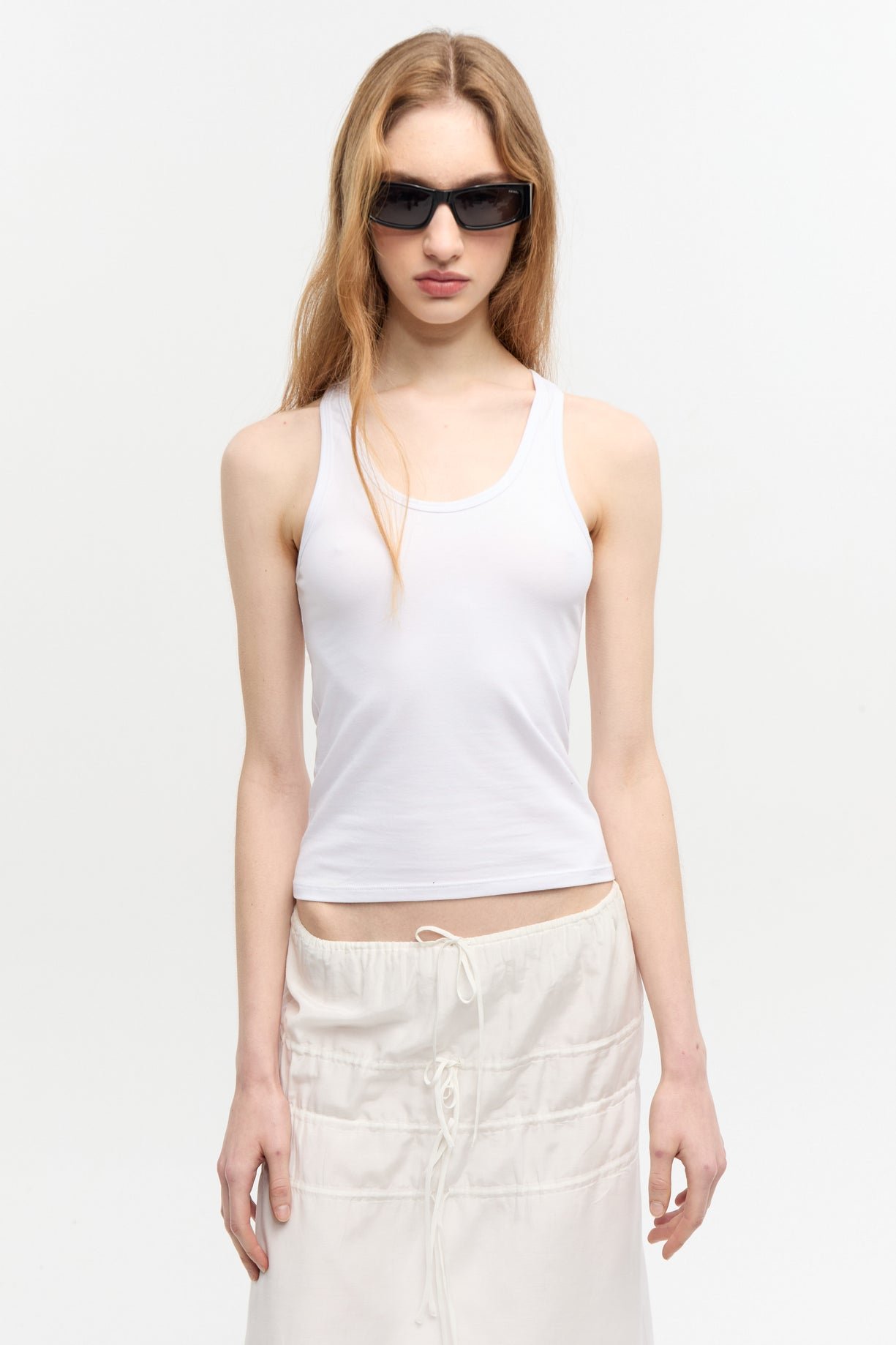 Musculosa con cuello U escotado en jersey de algodón con elastano. Calce fitted con largo a la primer cadera. Posee grifa de marca en espalda.
