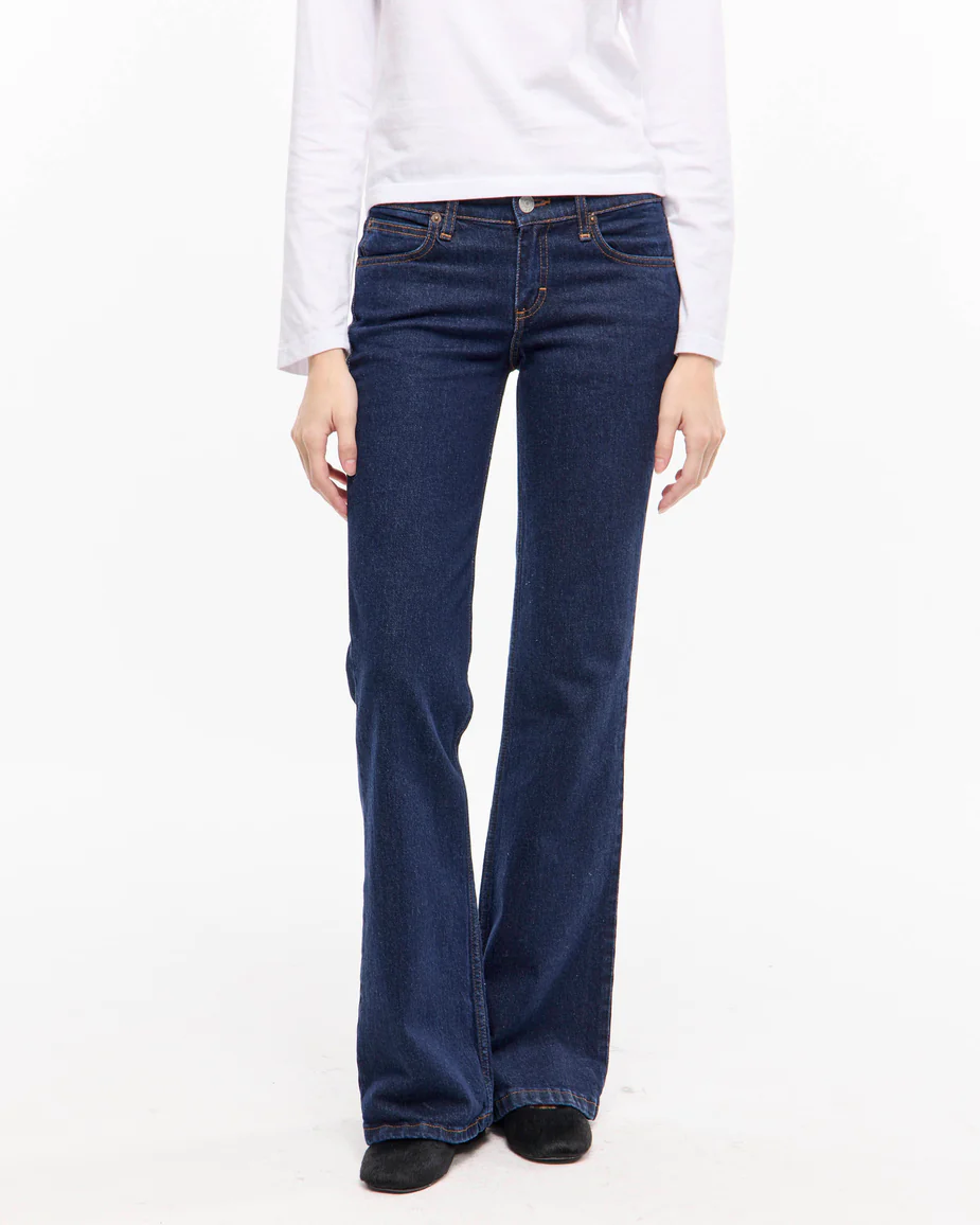 Jean 5 bolsillos, de tiro bajo, pierna ajustada que se va abriendo hacia la bota. Lavado clásico azul oscuro pre washed. Tejido importado de Egipto de algodón con lycra.
