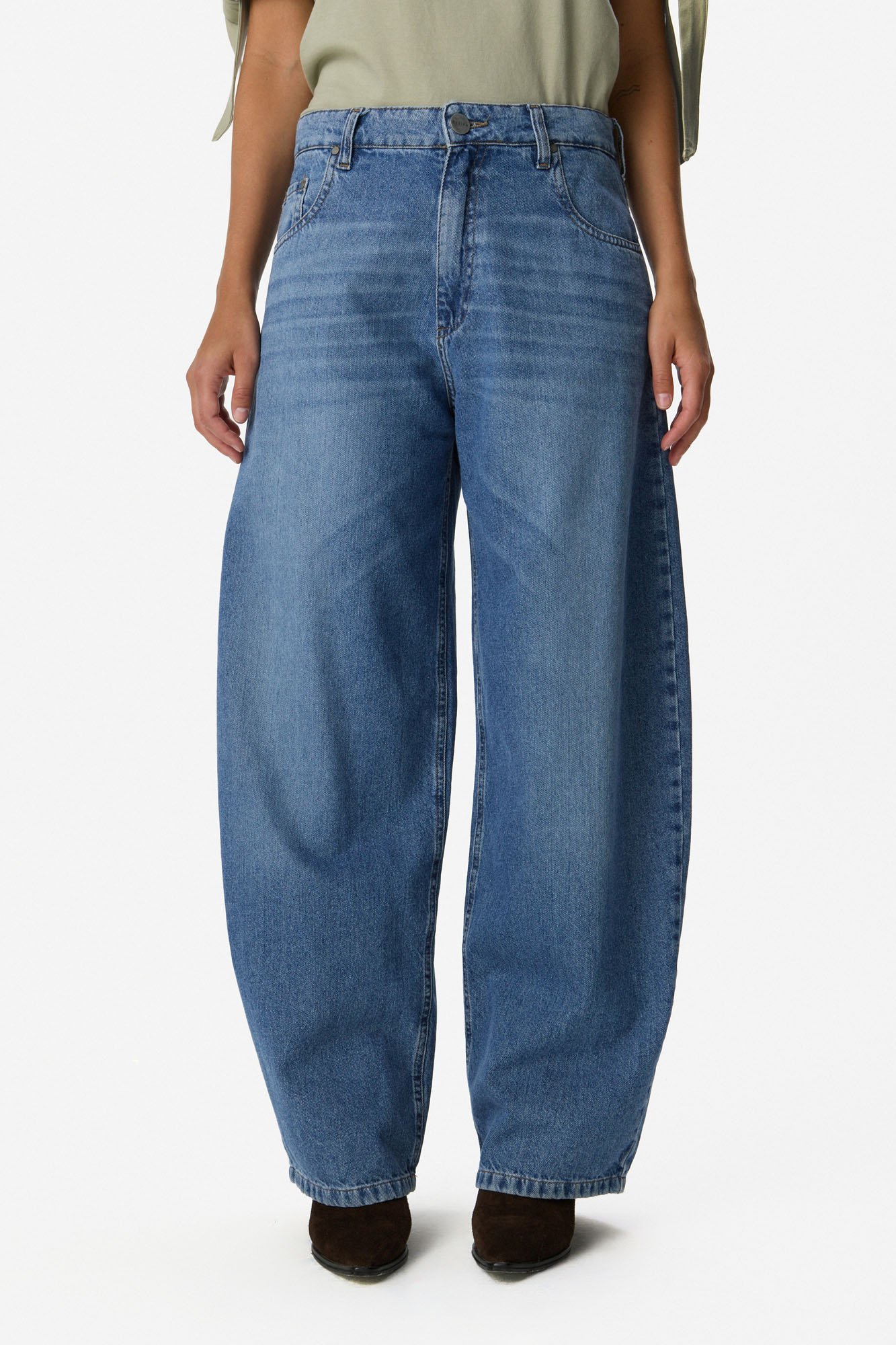Denim baggy de tiro alto con calce holgado y pierna amplia de caída recta. Lavado azul medio con sutil efecto desgastado frontal. Presenta bolsillos delanteros y presillas para cinturón. Cierre frontal con botón metálico y cremallera. 100% algodón.