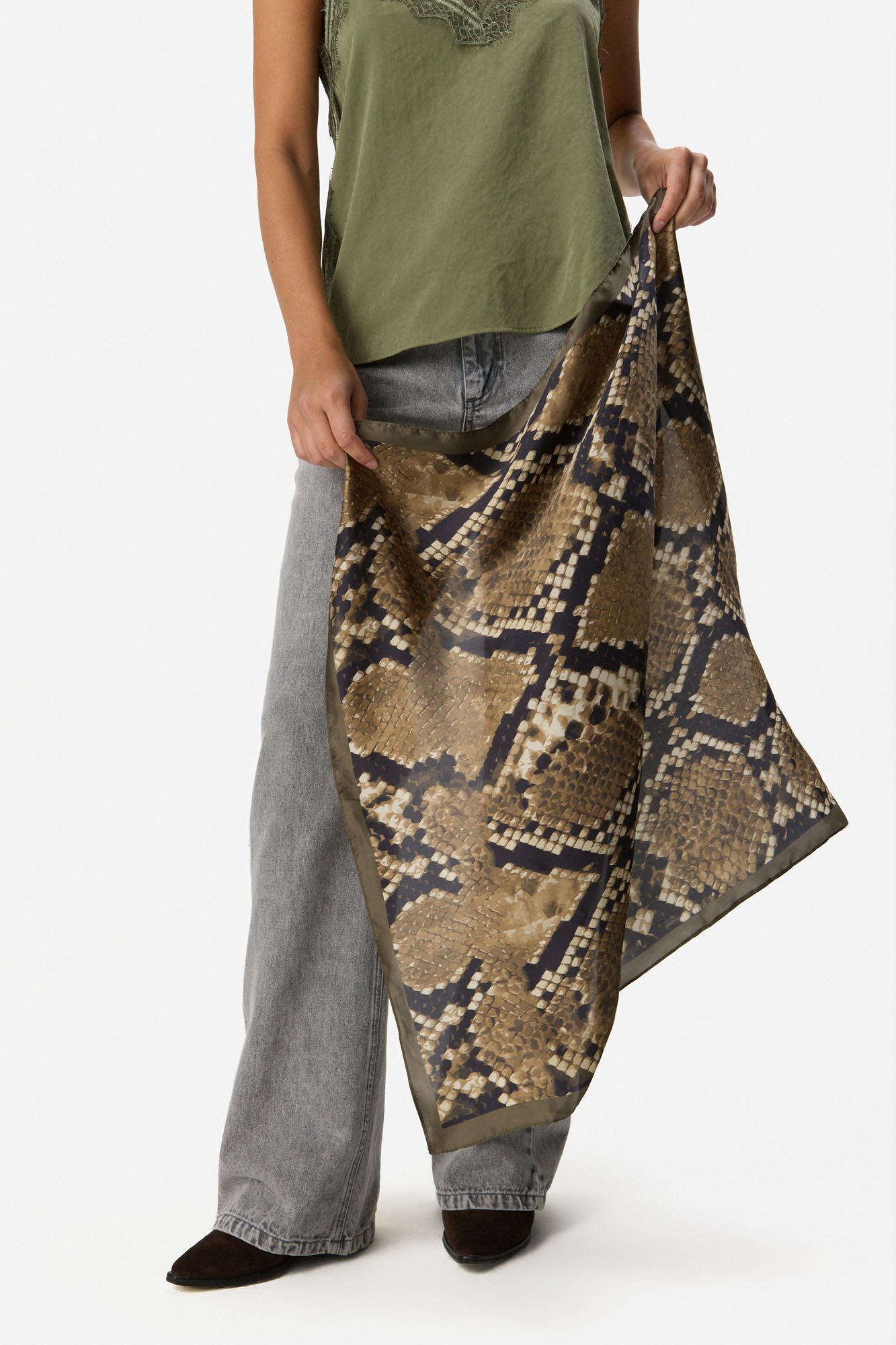 Pañuelo de poliéster de 66 x 67 cm. Estampa en reptil con meticulosos detalles y sofisticado nivel de resolución. 100% poliéster.