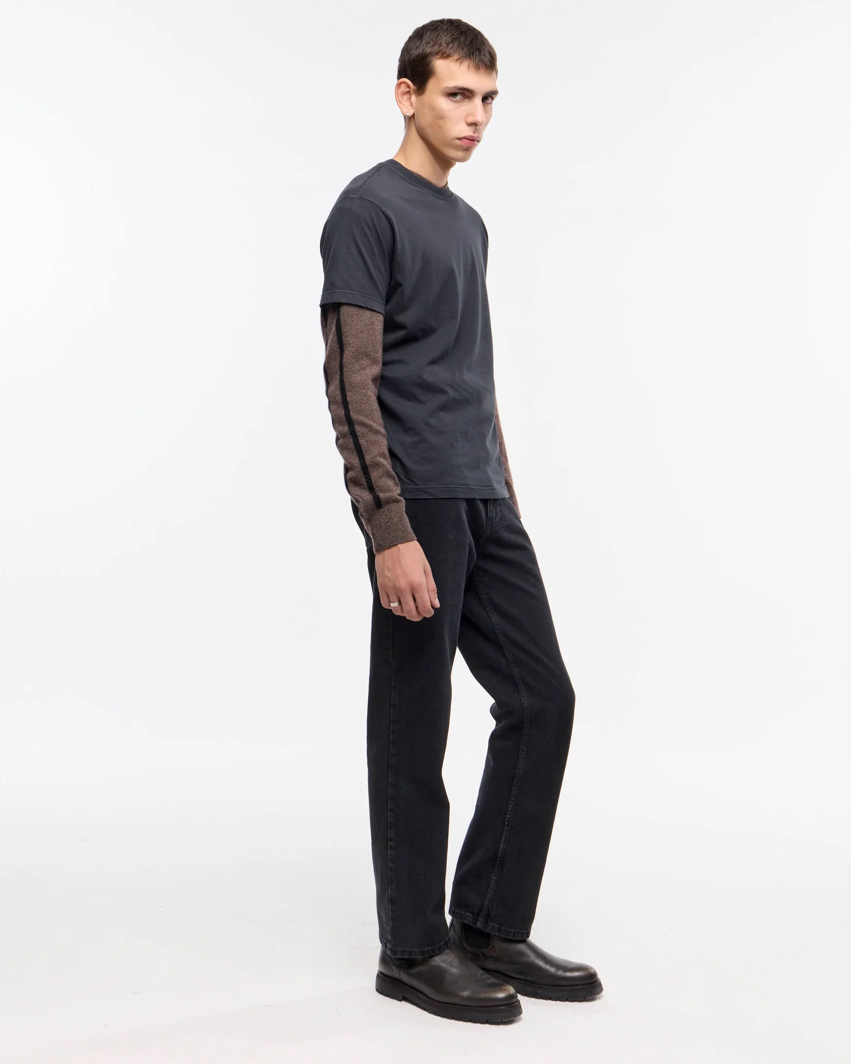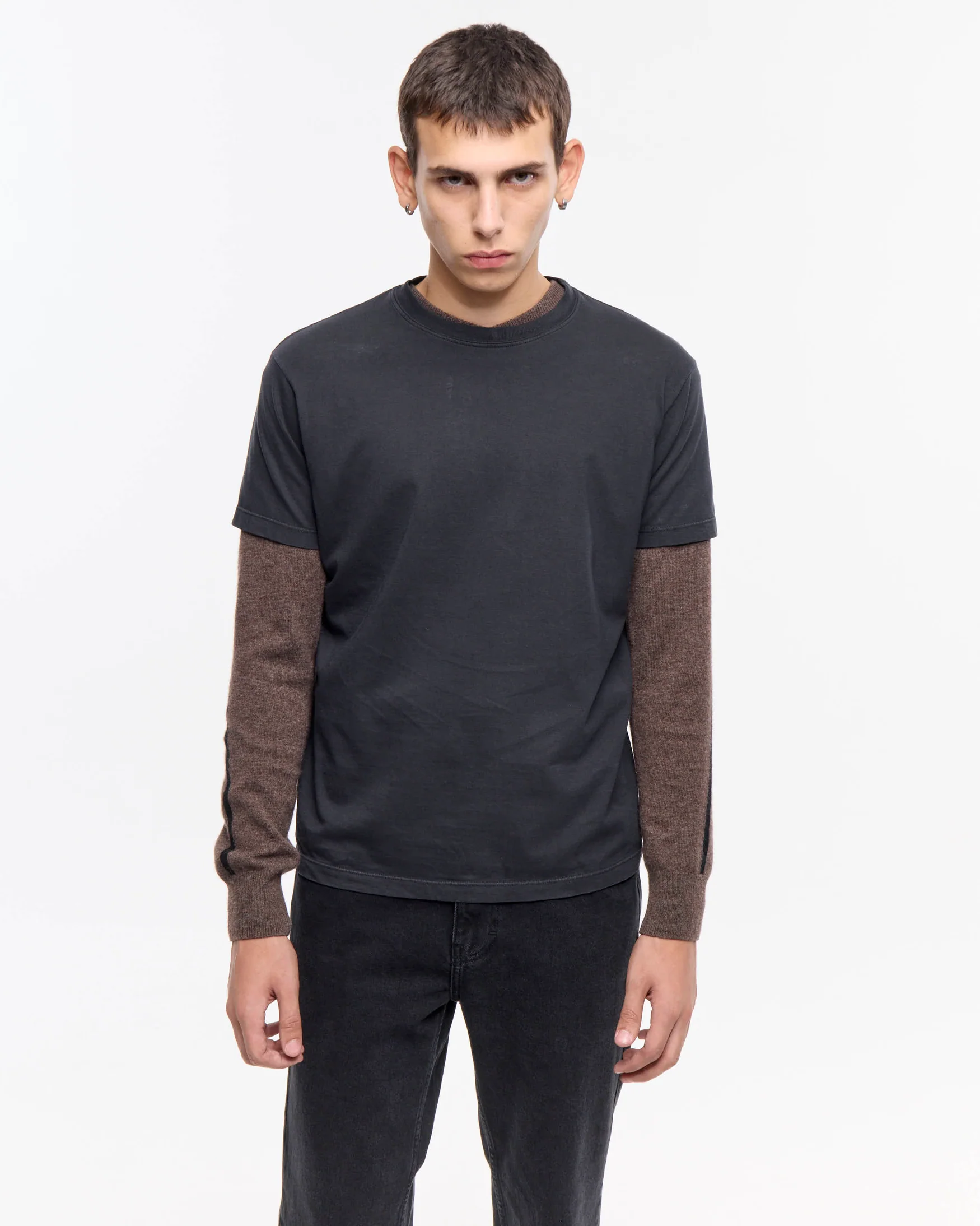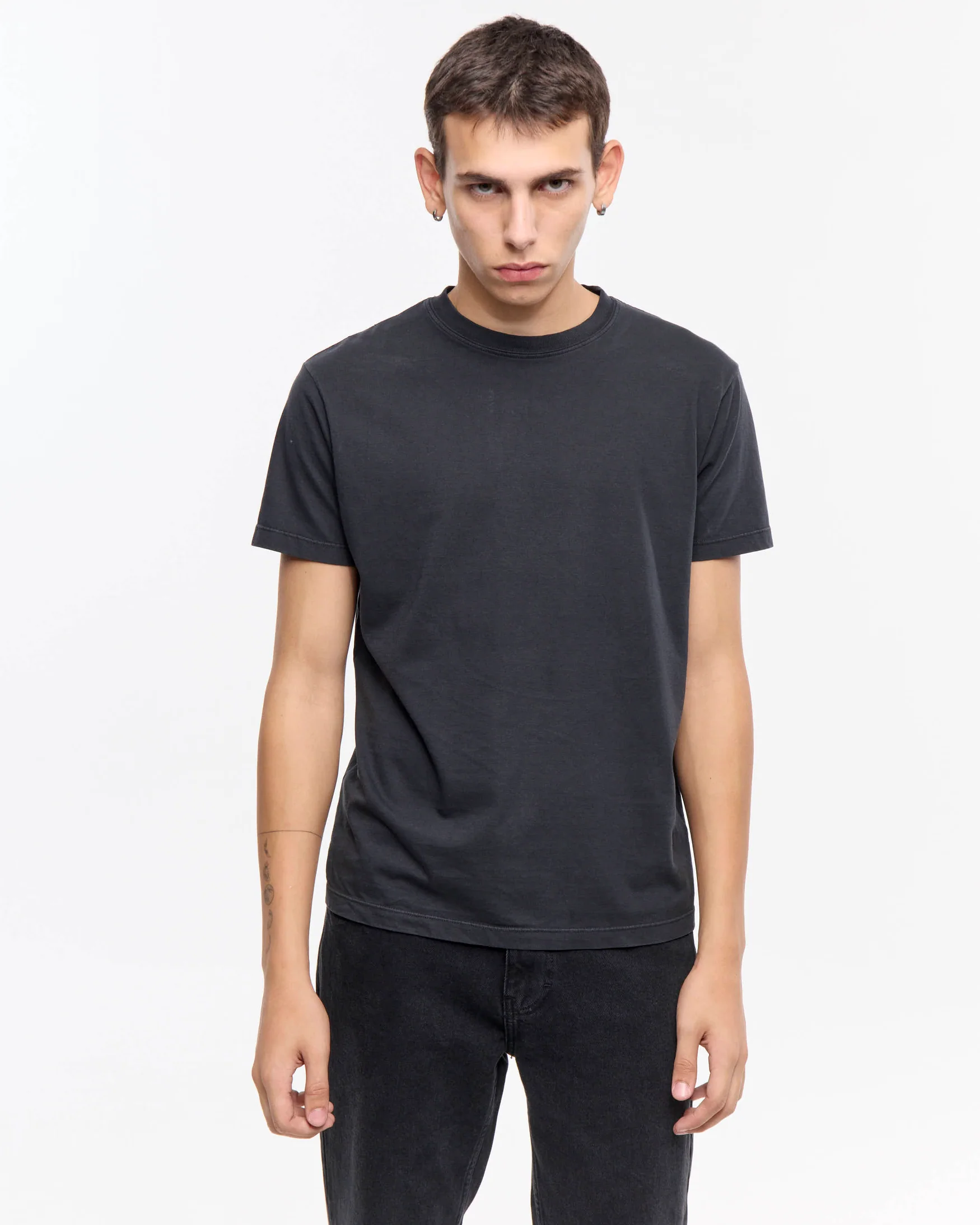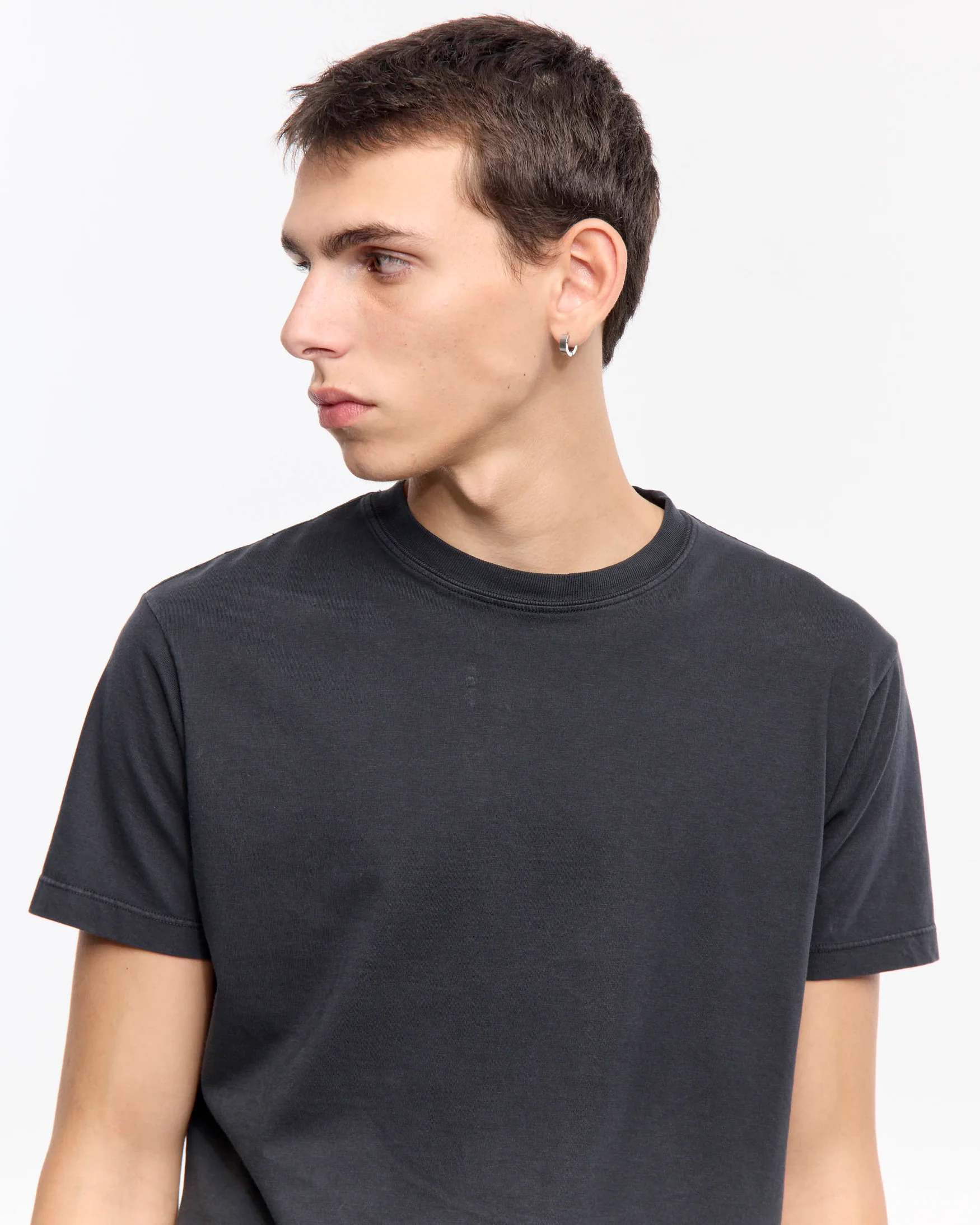 Remera manga corta de cuello redondo y calce regular en jersey de algodón. Teñido y gastado en prenda. Posee grifa de marca en espalda.