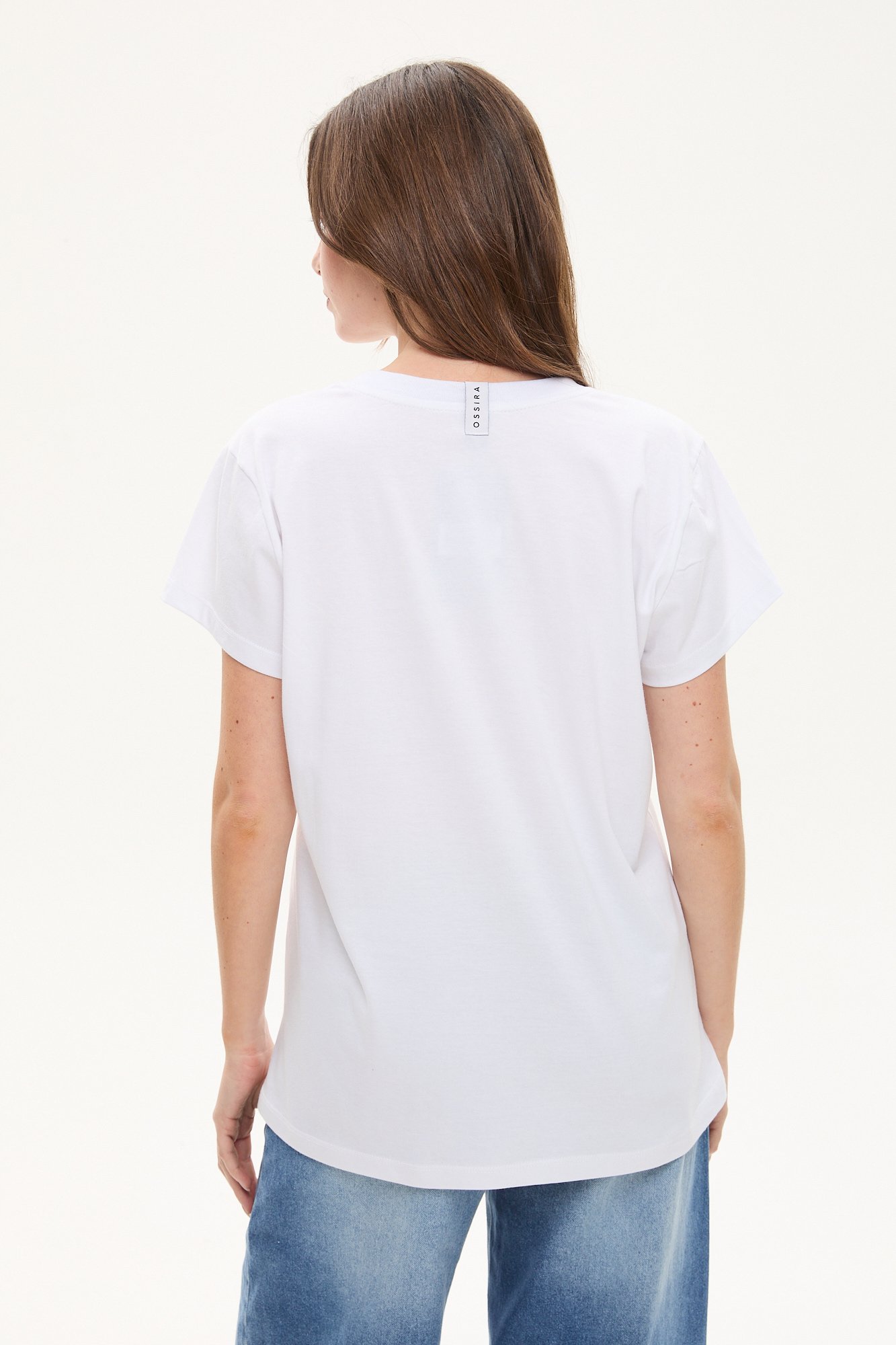 REMERA OSSIRA DE ALGODÓN BÁSICA CON ESTAMPA EN COLOR. CUELLO REDONDO. LARGO HASTA CADERA.