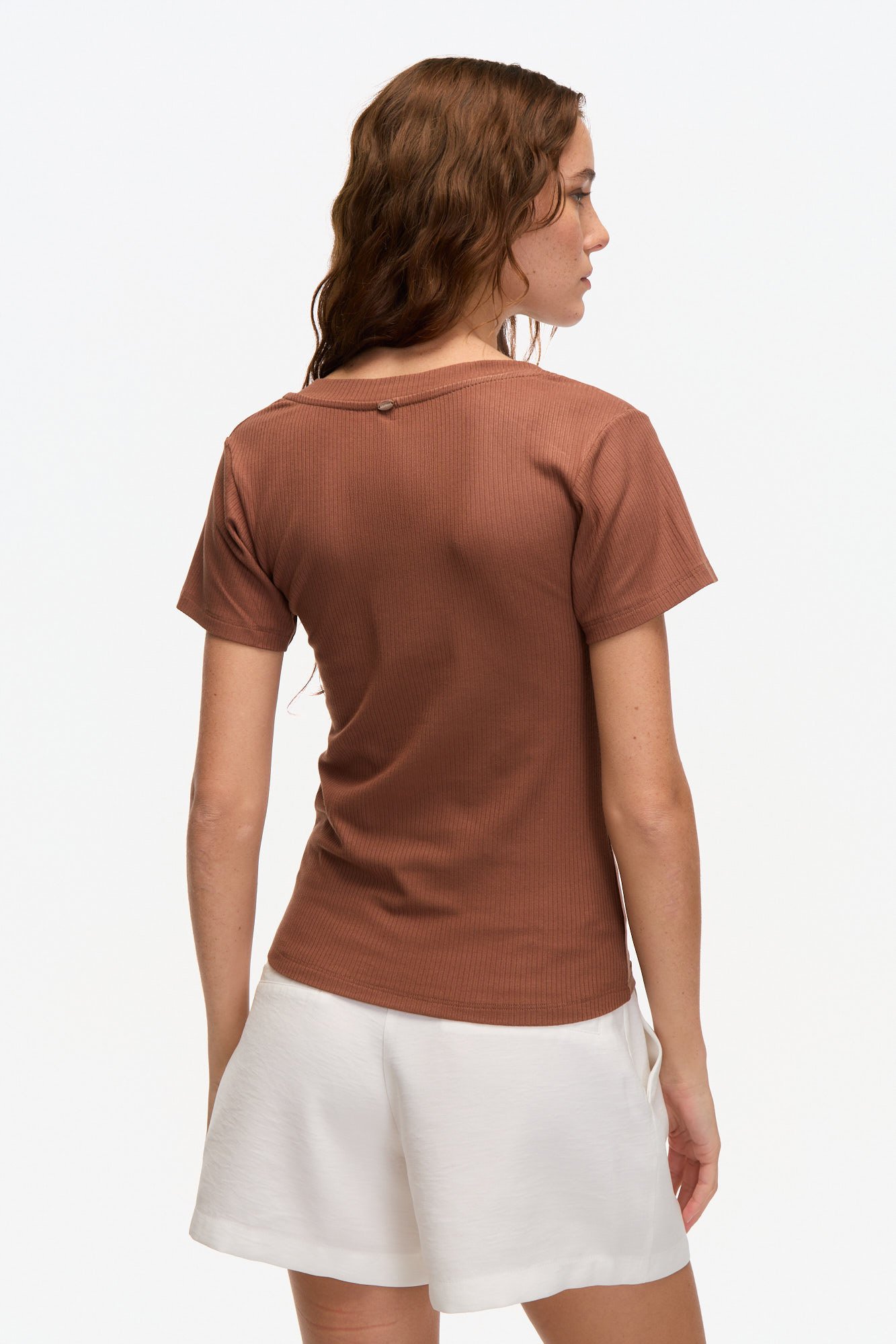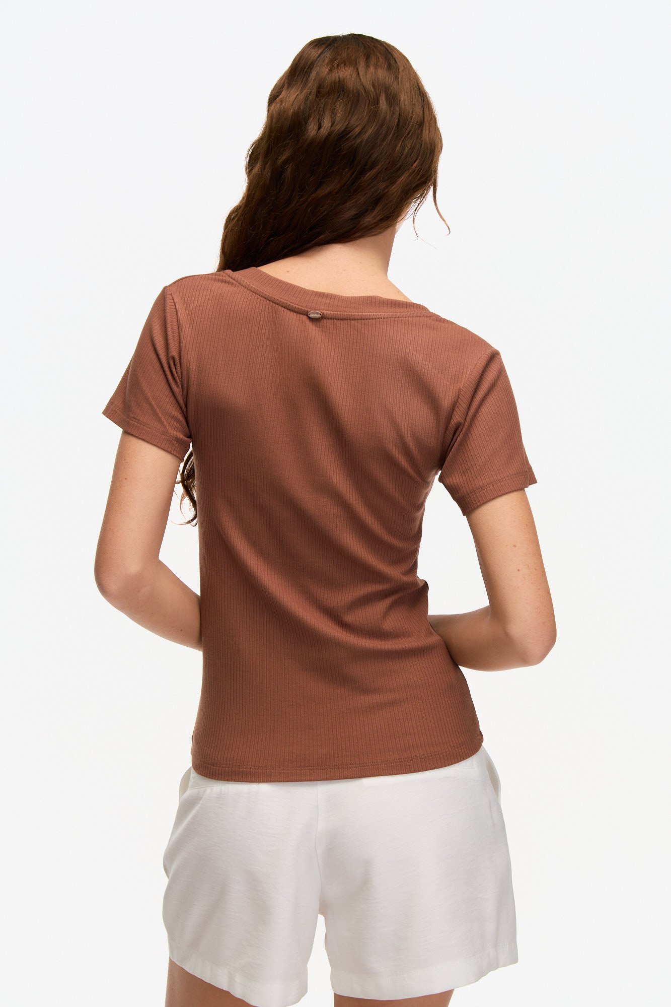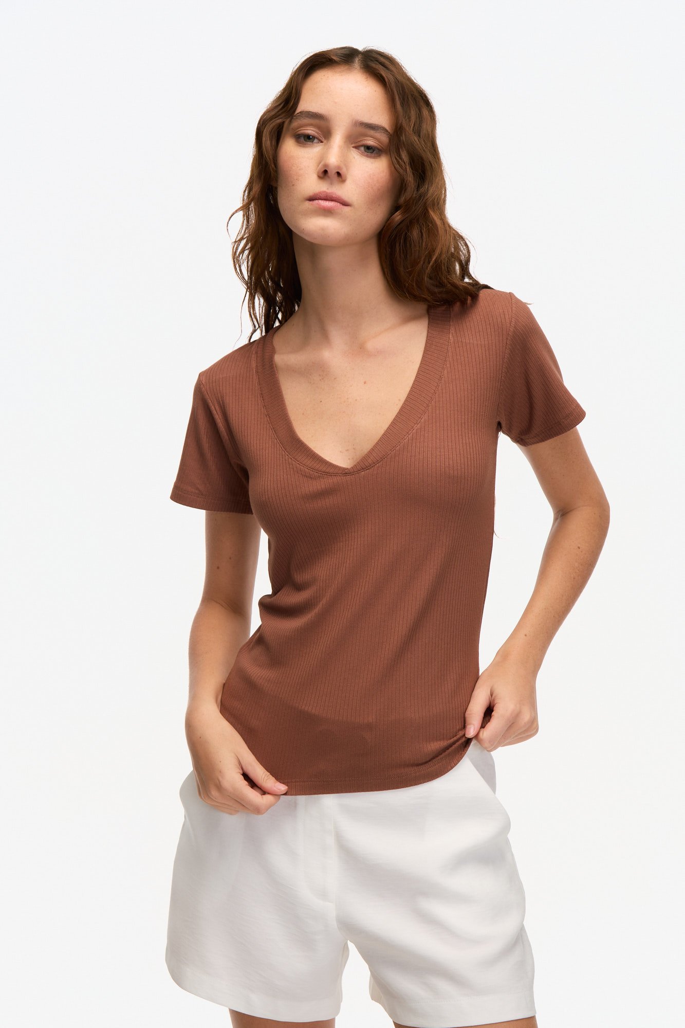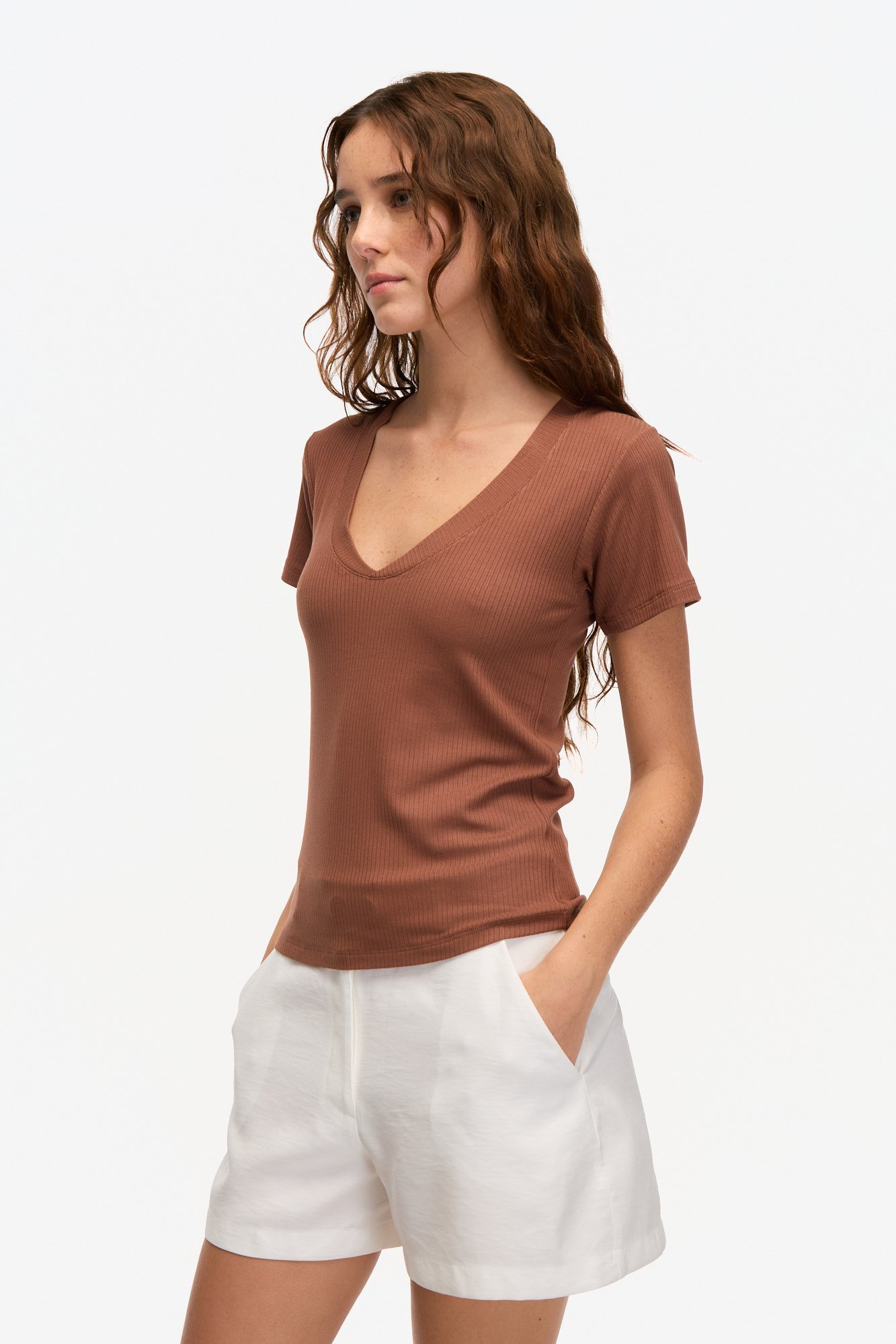 CONFECCIONADA EN TEJIDO MORLEY DE RAYÓN CON SPANDEX, SUAVE Y ELÁSTICO. DISEÑO DE MANGAS CORTAS, ESCOTE EN “V” Y SILUETA AL CUERPO CON LARGO A LA CADERA.
