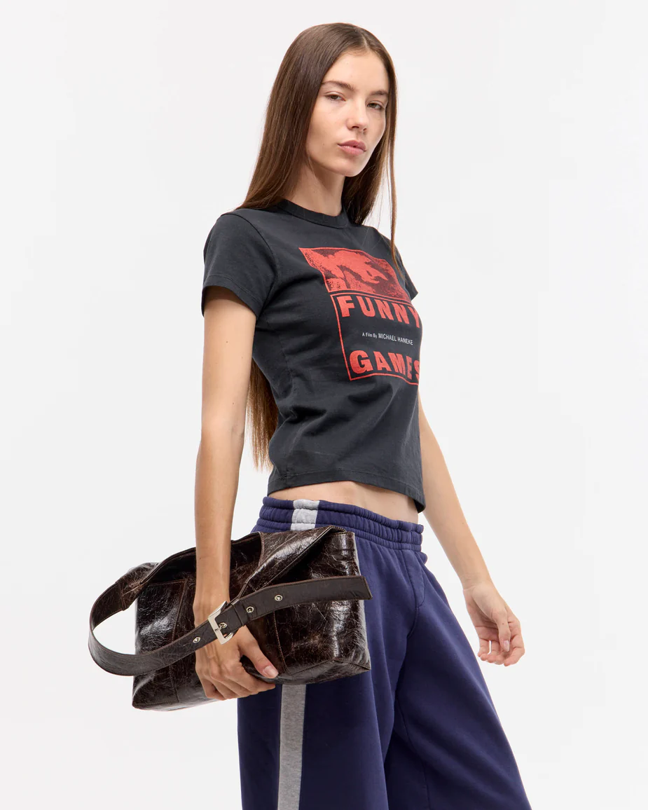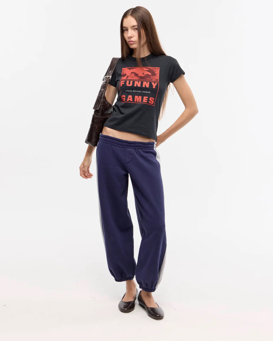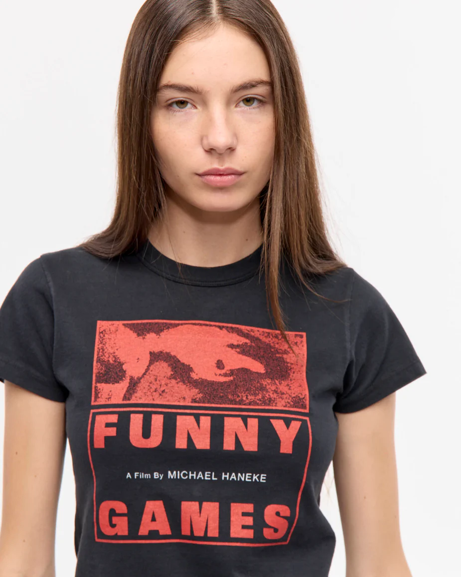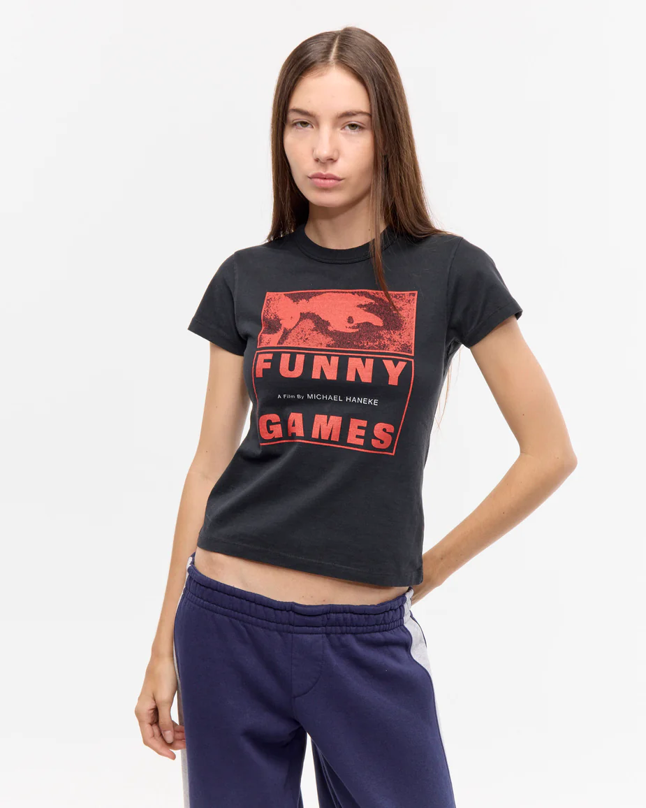 Remera manga corta con cuello redondo en jersey de algodón. Calce regular con largo a la primer cadera. Estampa ´FUNNY GAMES´ en delantero. Posee grifa de marca en espalda.