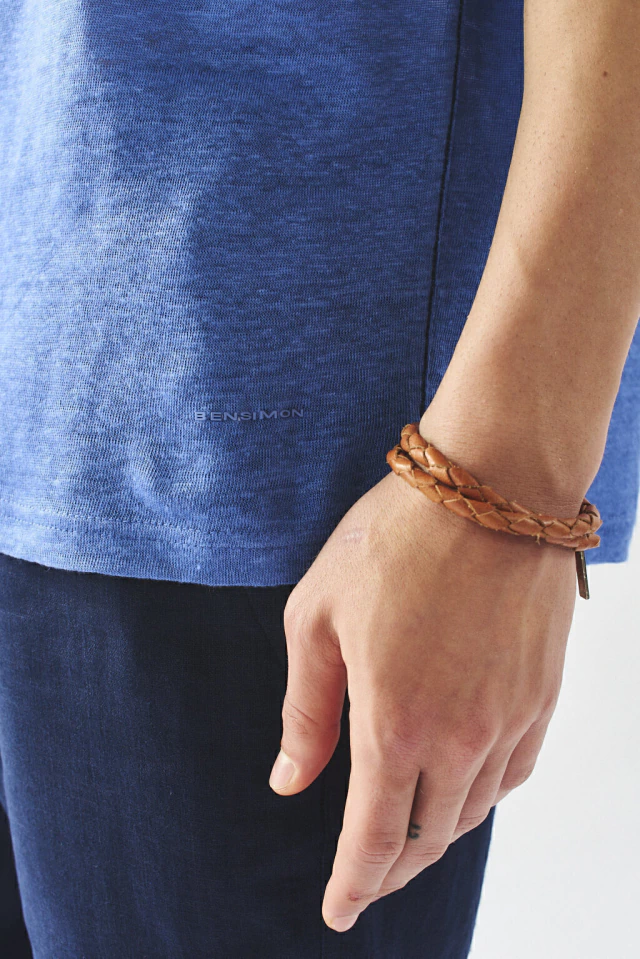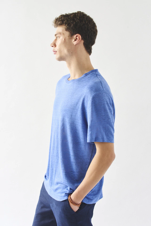 Remera manga corta de calce regular confeccionada en Lino 100%. Con cuello de ribb, costura lateral en cadena y tajos.