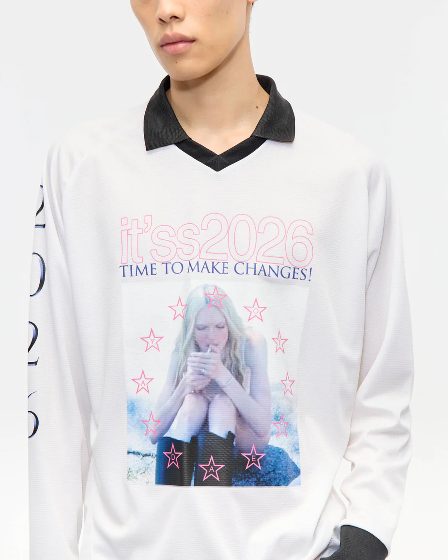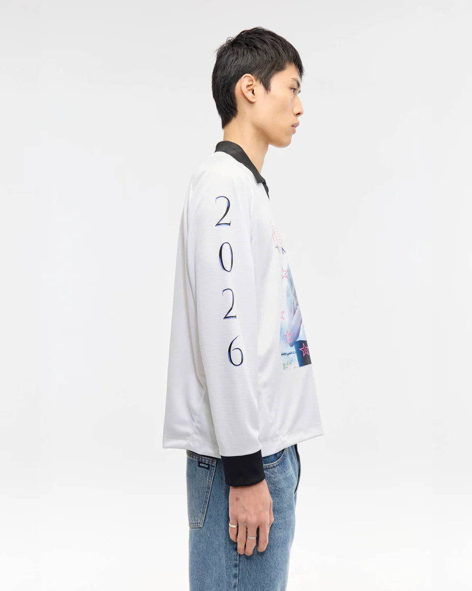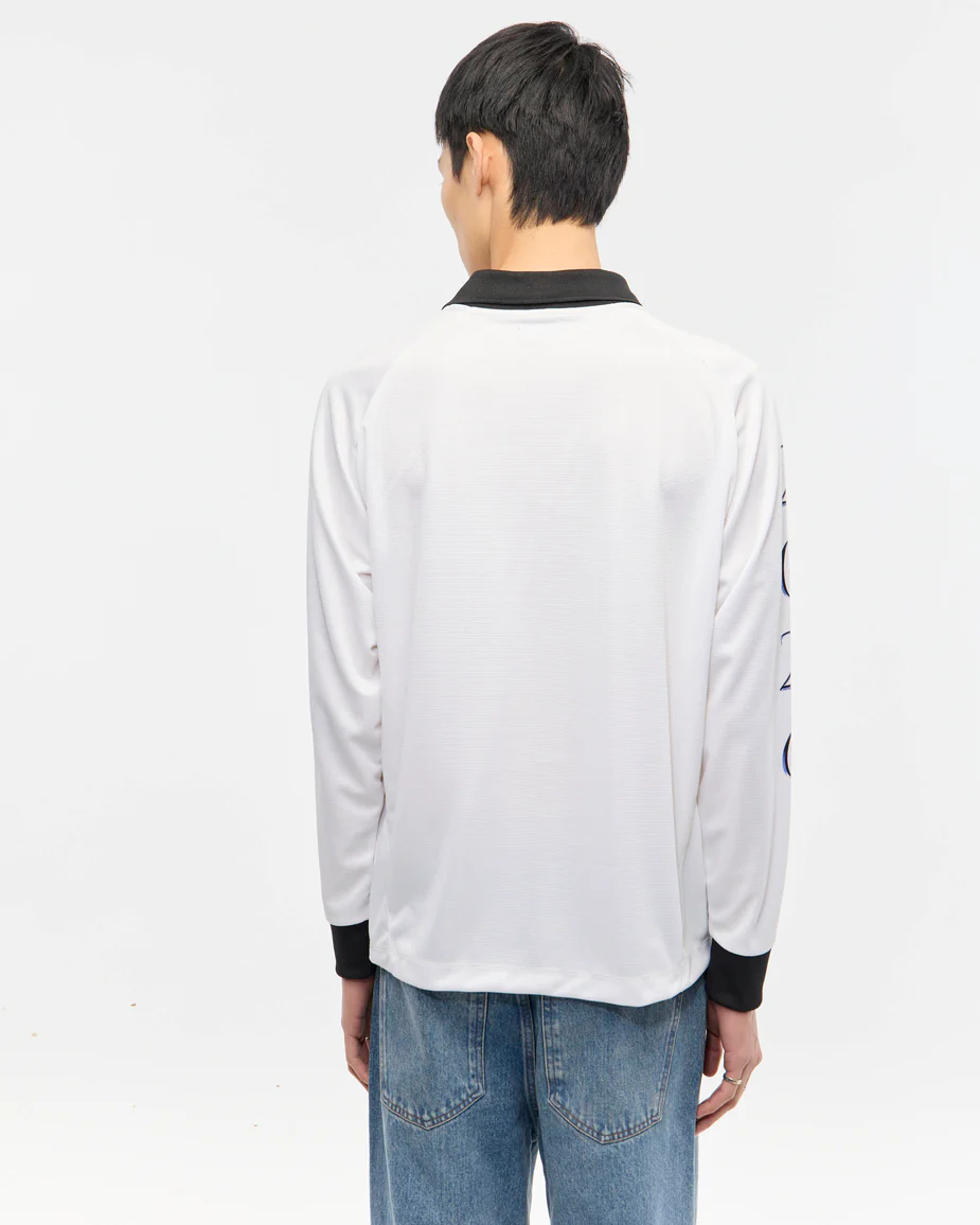 Remera manga larga con cuello polo y calce over en mujer y regular en hombre. Confeccionada con tela deportiva calada. Cuello y puños tejidos en negro. Estampa en delantero y mangas.