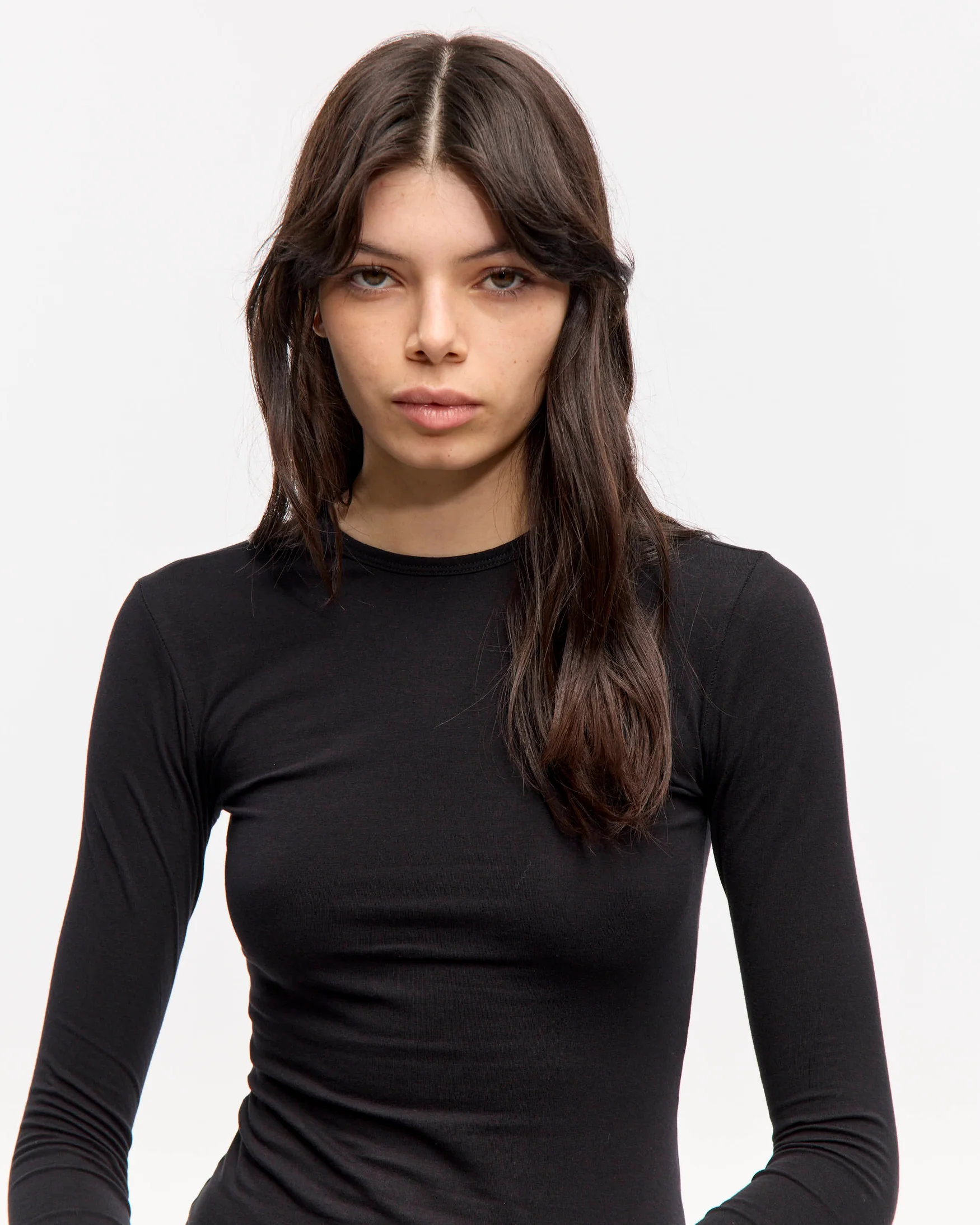 Remera manga larga con escote redondo en algodón con elastano. Calce fitted con largo a la primer cadera. Posee grifa de marca en espalda.