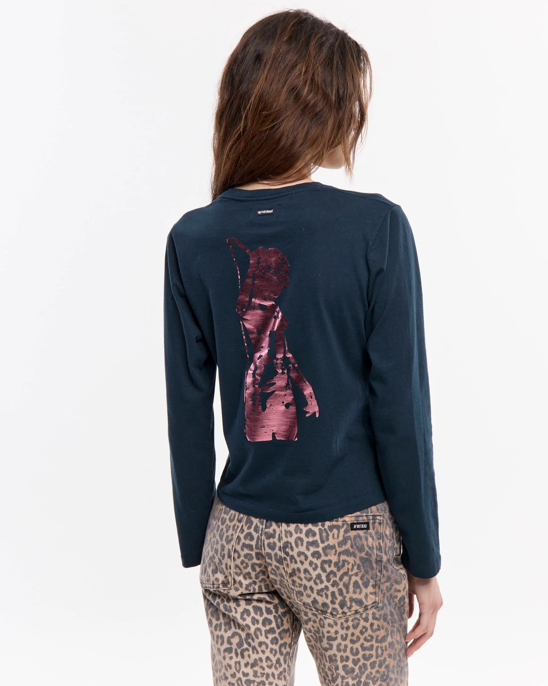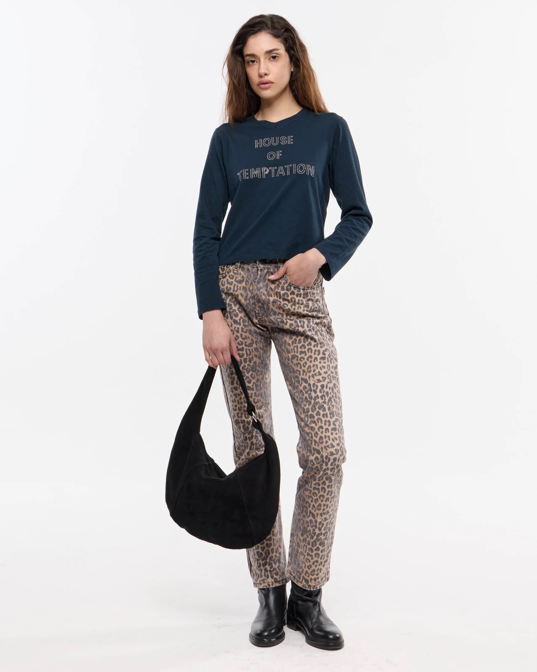 Remera manga larga con escote en V en jersey de algodón. Calce fitted con largo a la primer cadera. Estampa hot fix ´HOUSE OF TEMPTATION´ en delantero + estampa en foil rosa en espalda. Posee grifa de marca en espalda.