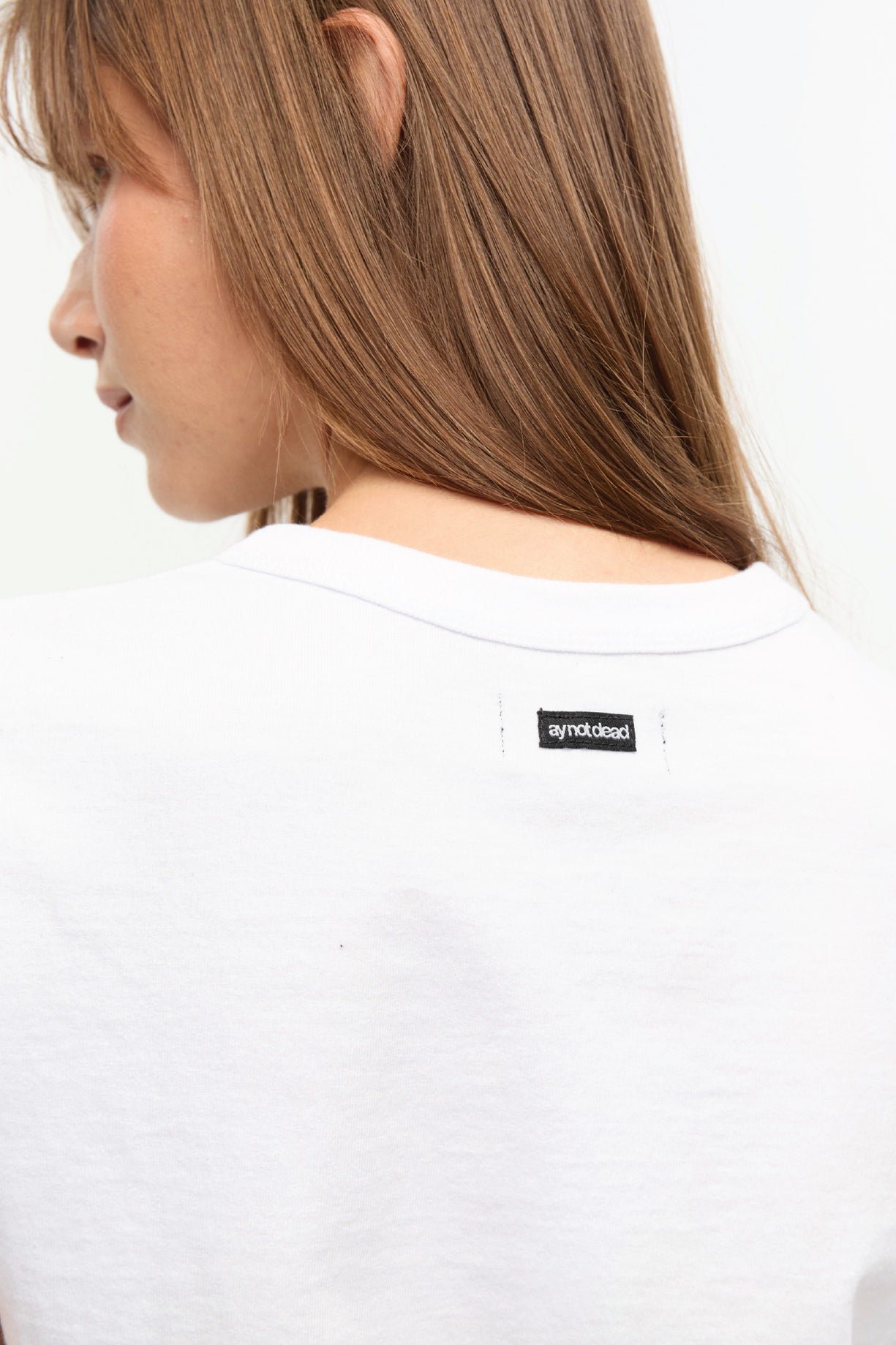 Remera manga corta con cuello redondo en jersey de algodón pesado. Calce fitted con largo a la primer cadera. Estampa central en frente. Posee grifa de marca en espalda.