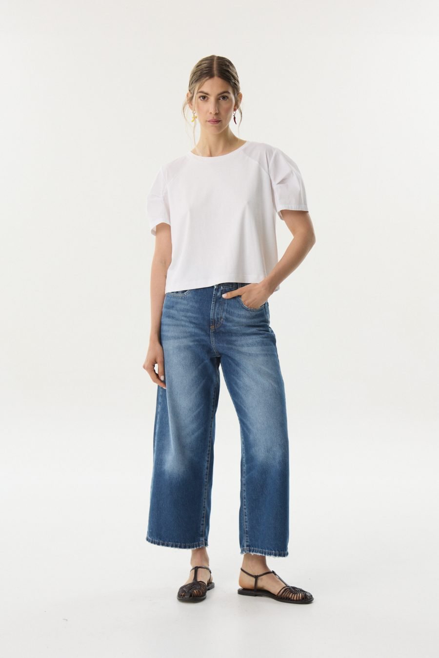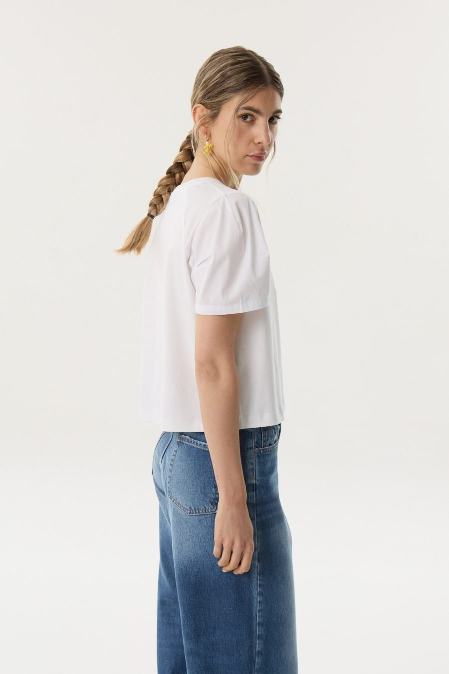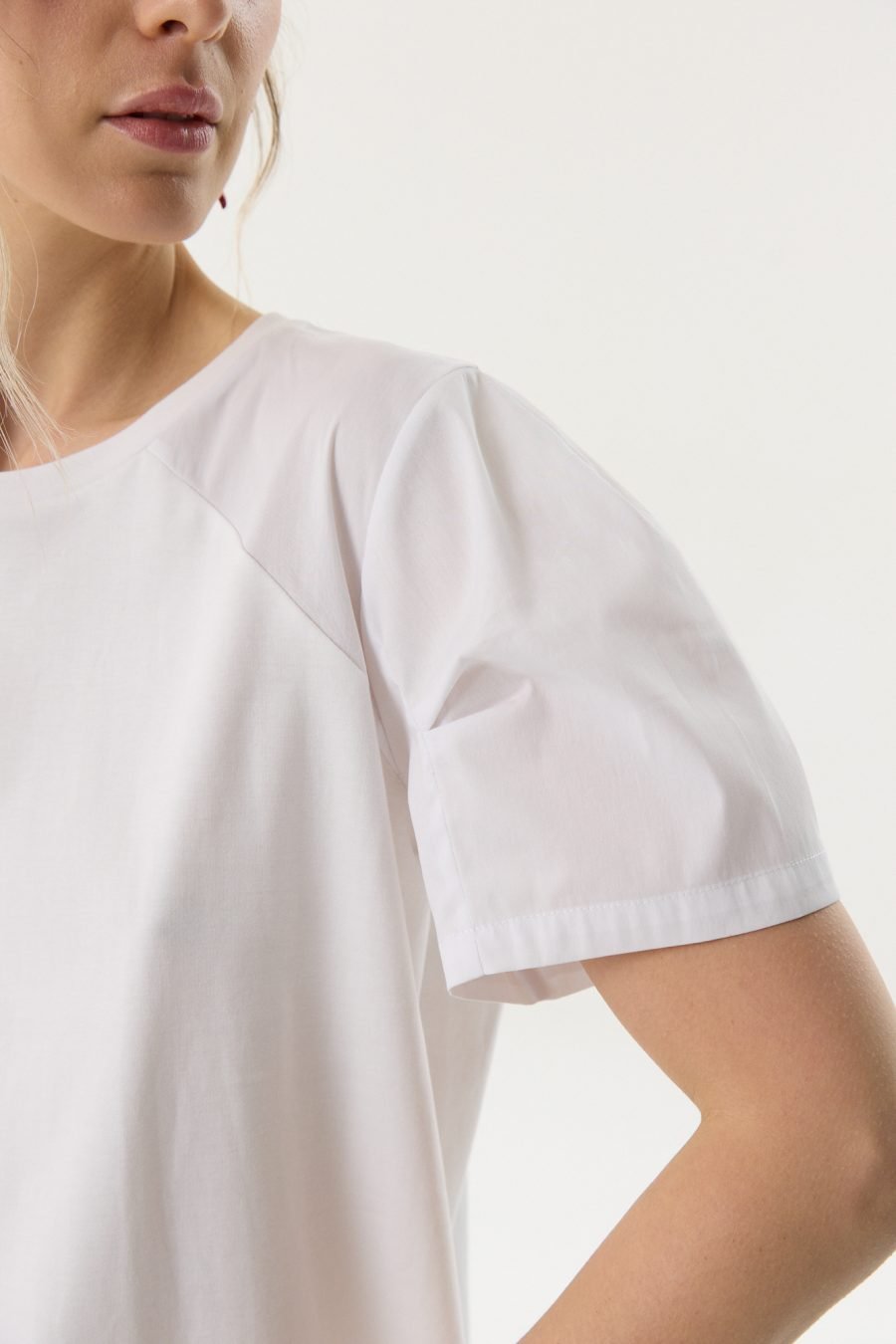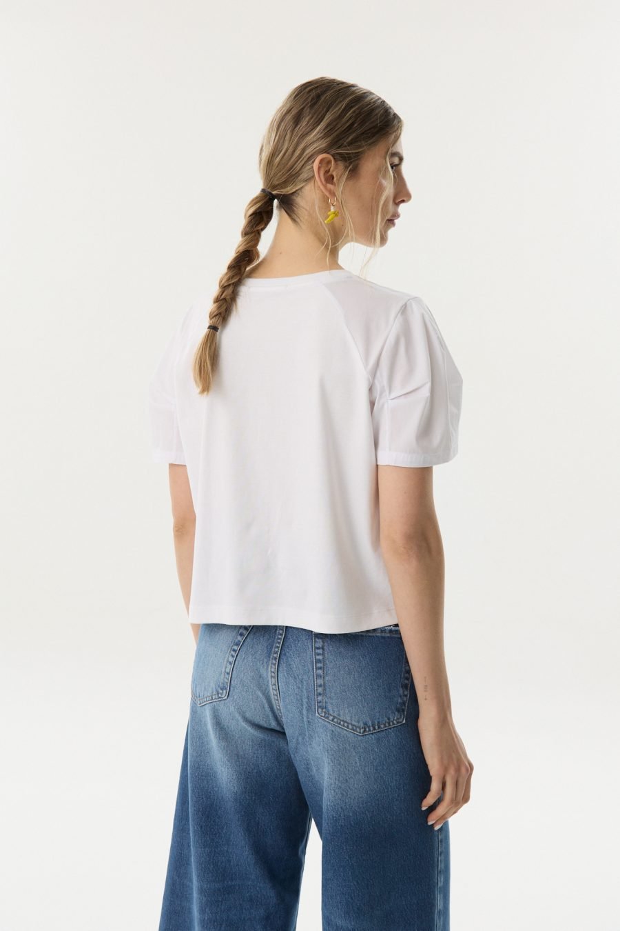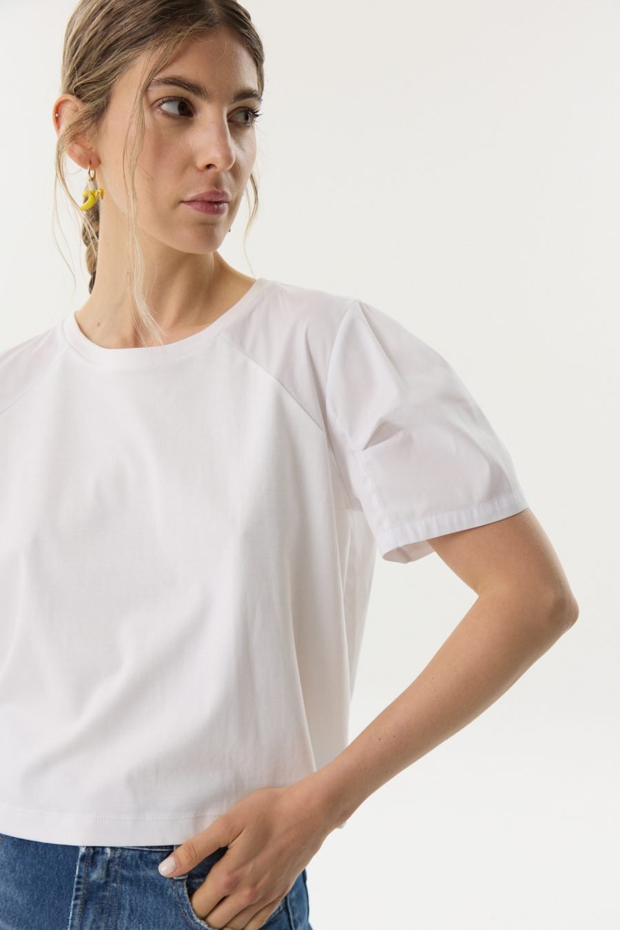 Remera manga corta de algodón. Es el básico que necesitás pero con un toque diferente, esta remera está confeccionada en jersey de algodón y tiene mangas de poplin al tono. Es de largo a la cadera, ideal para acompañar todos tus jeans tiro alto!