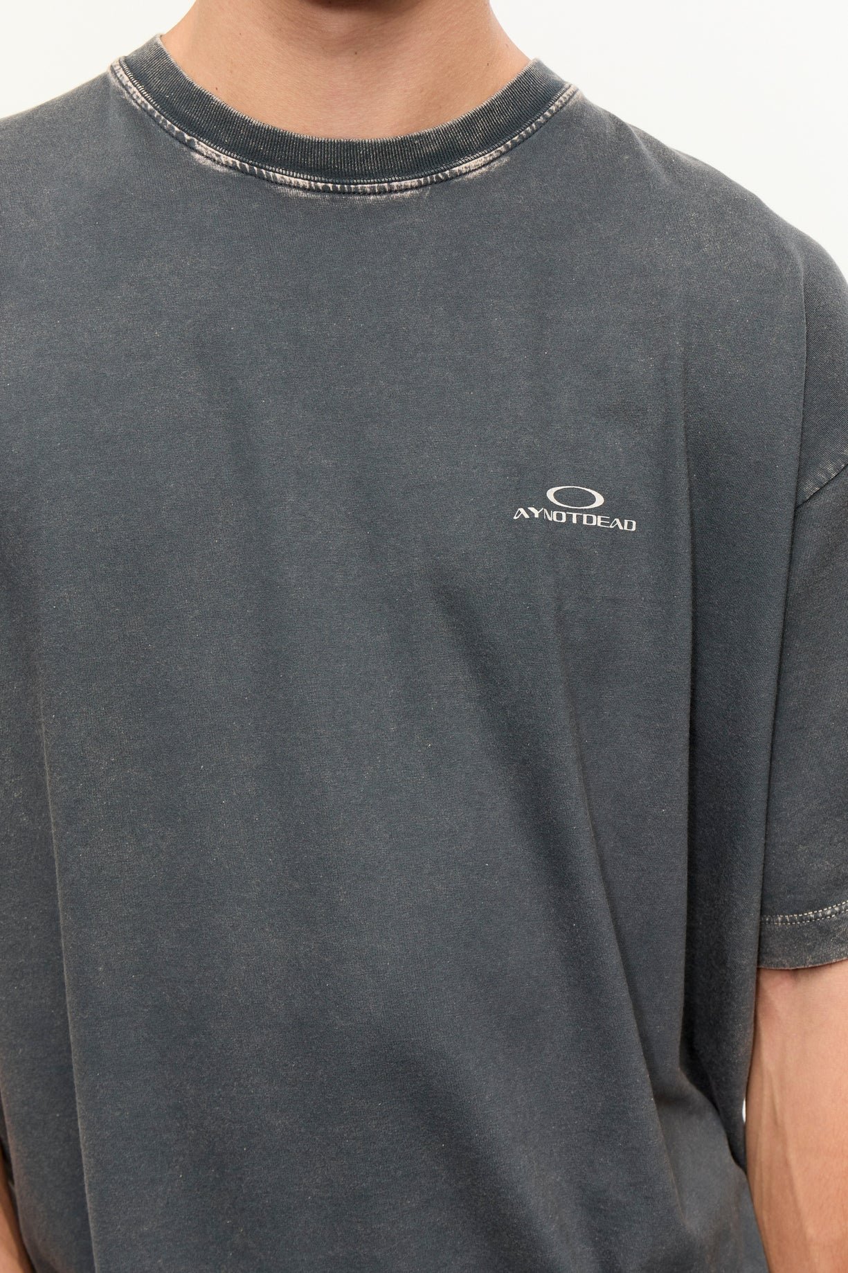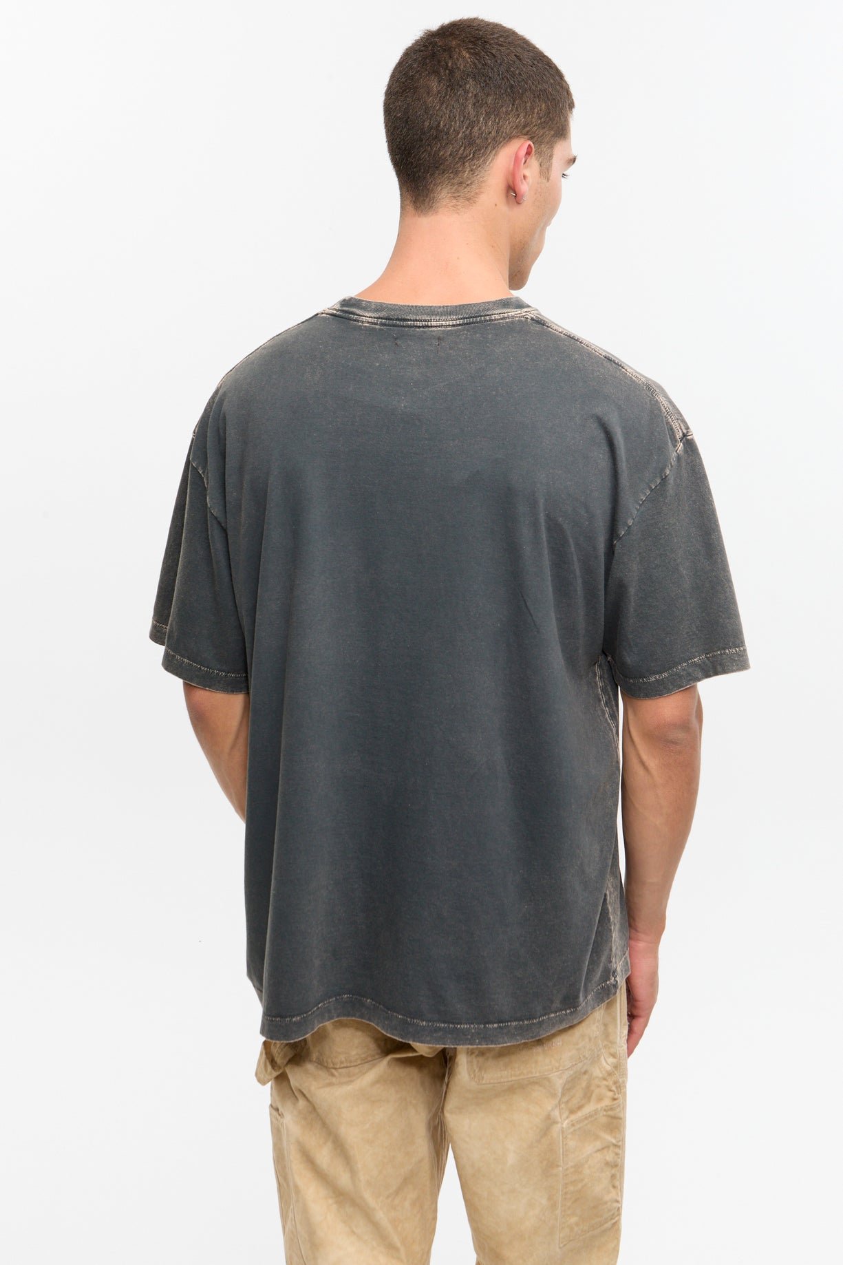 Remera manga corta de cuello redondo y calce oversize en jersey de algodón liviano. Teñido en prenda y gastado laser. Logo de temporada estampado en delantero.