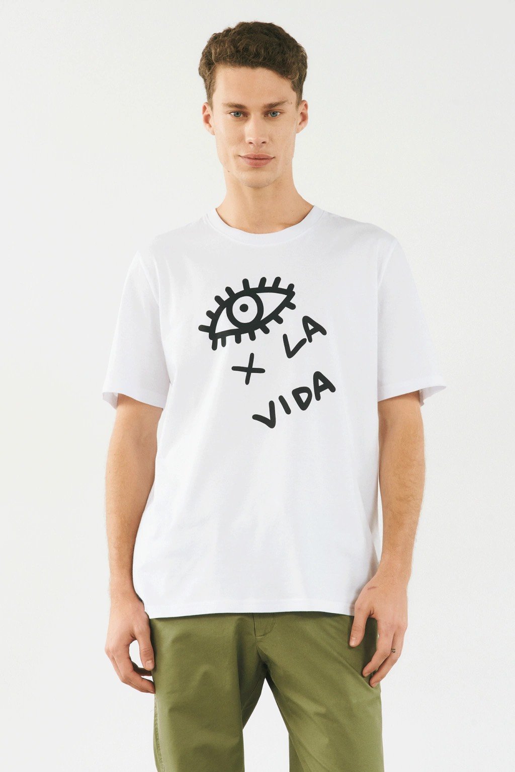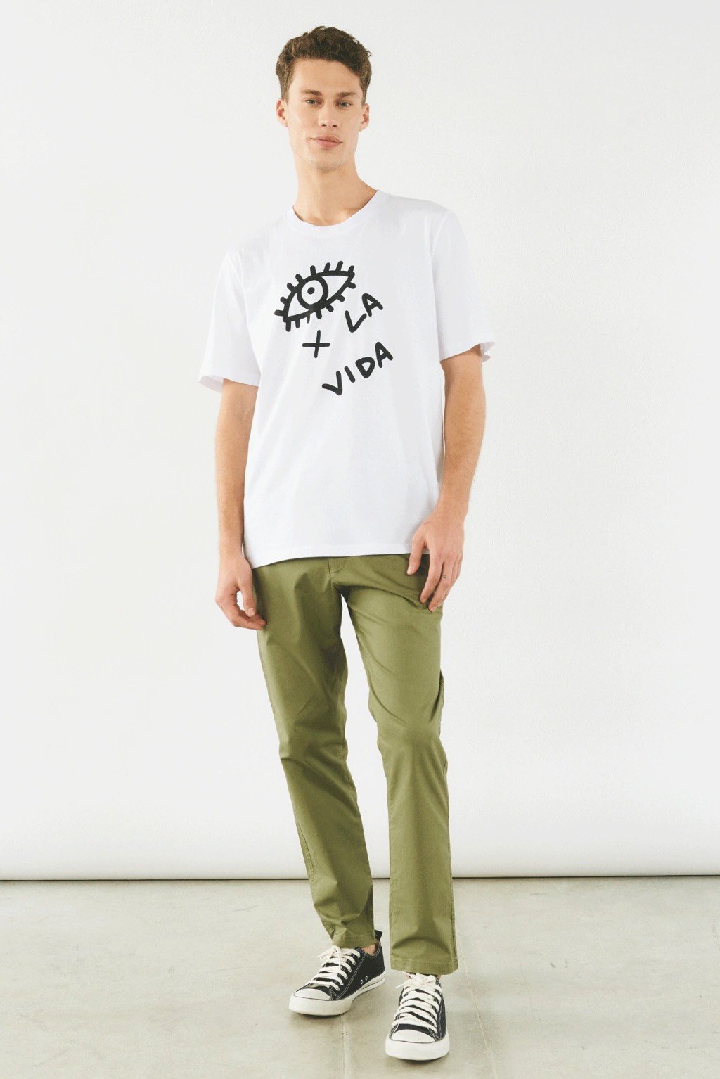 Remera manga corta con cuello redondo en jersey de algodón. Calce regular con largo a la cadera. Estampa «X LA VIDA» en delantero.