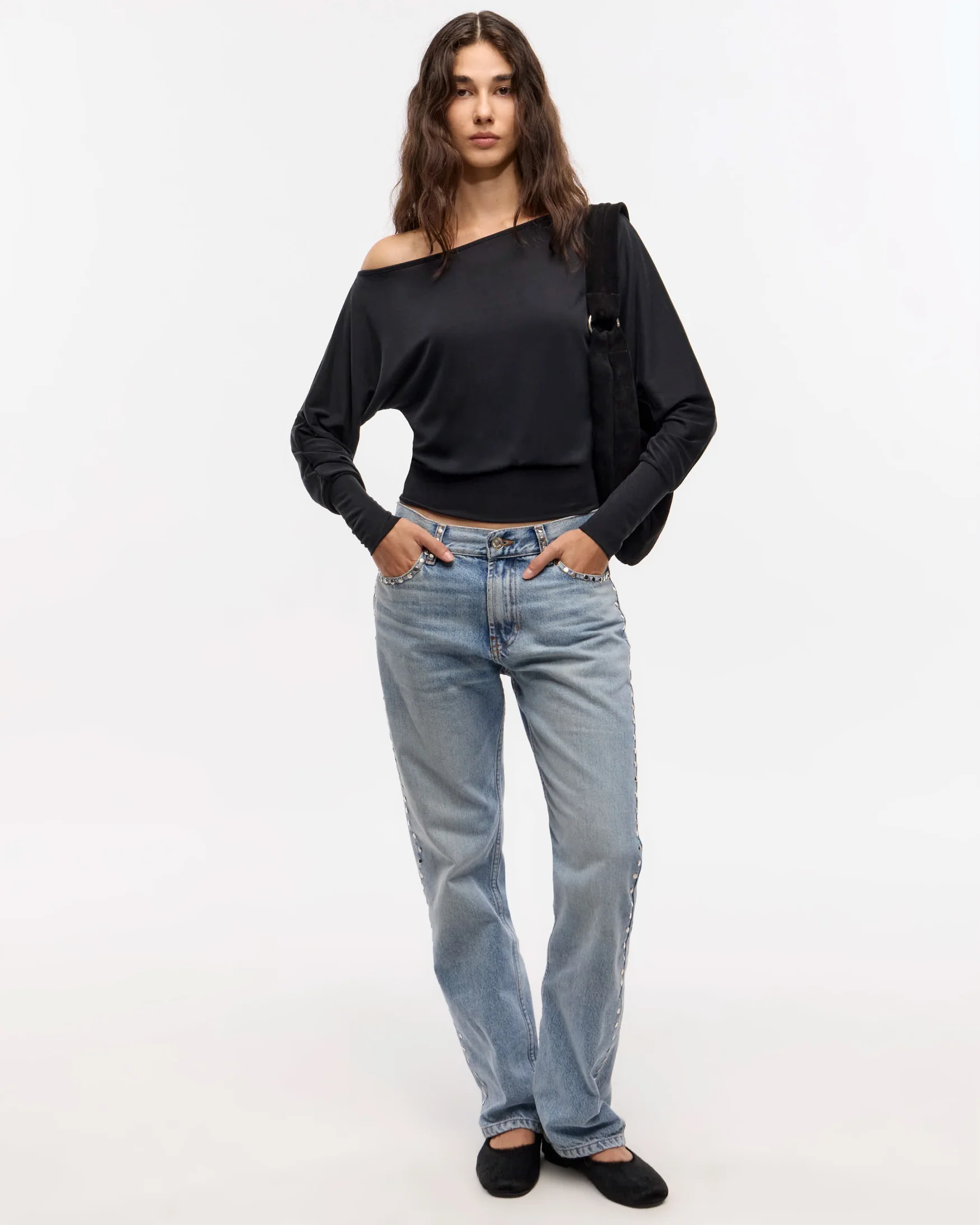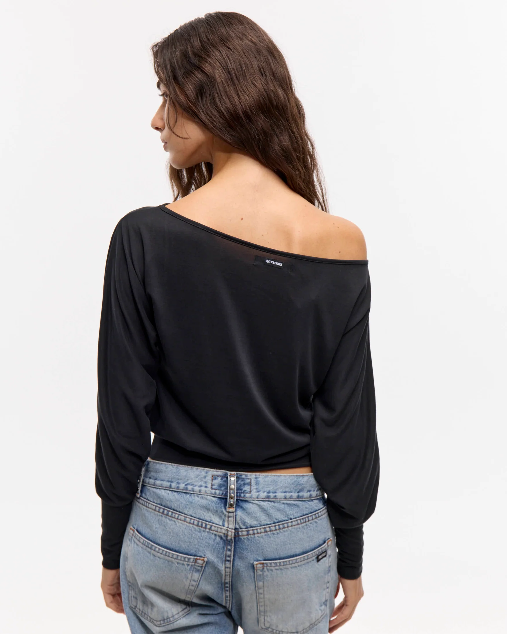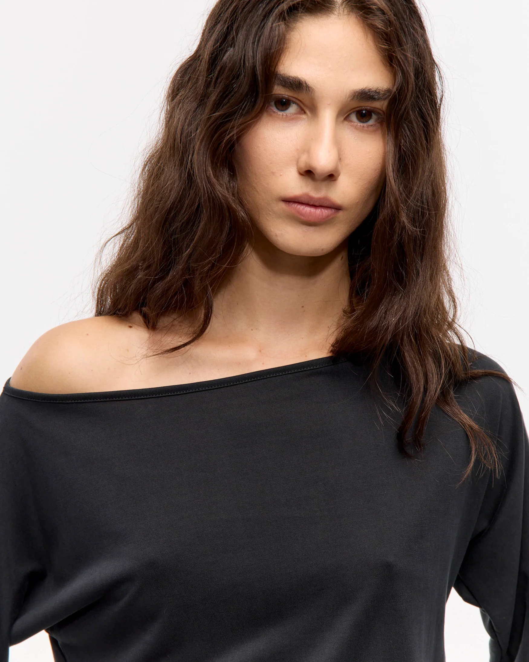 Top confeccionado en modal con efecto peach. De mangas largas, escote asimétrico, calce holgado en la zona superior y recorte ajustado en el bajo. Largo a la primera cadera. Posee grifa de marca en espalda.