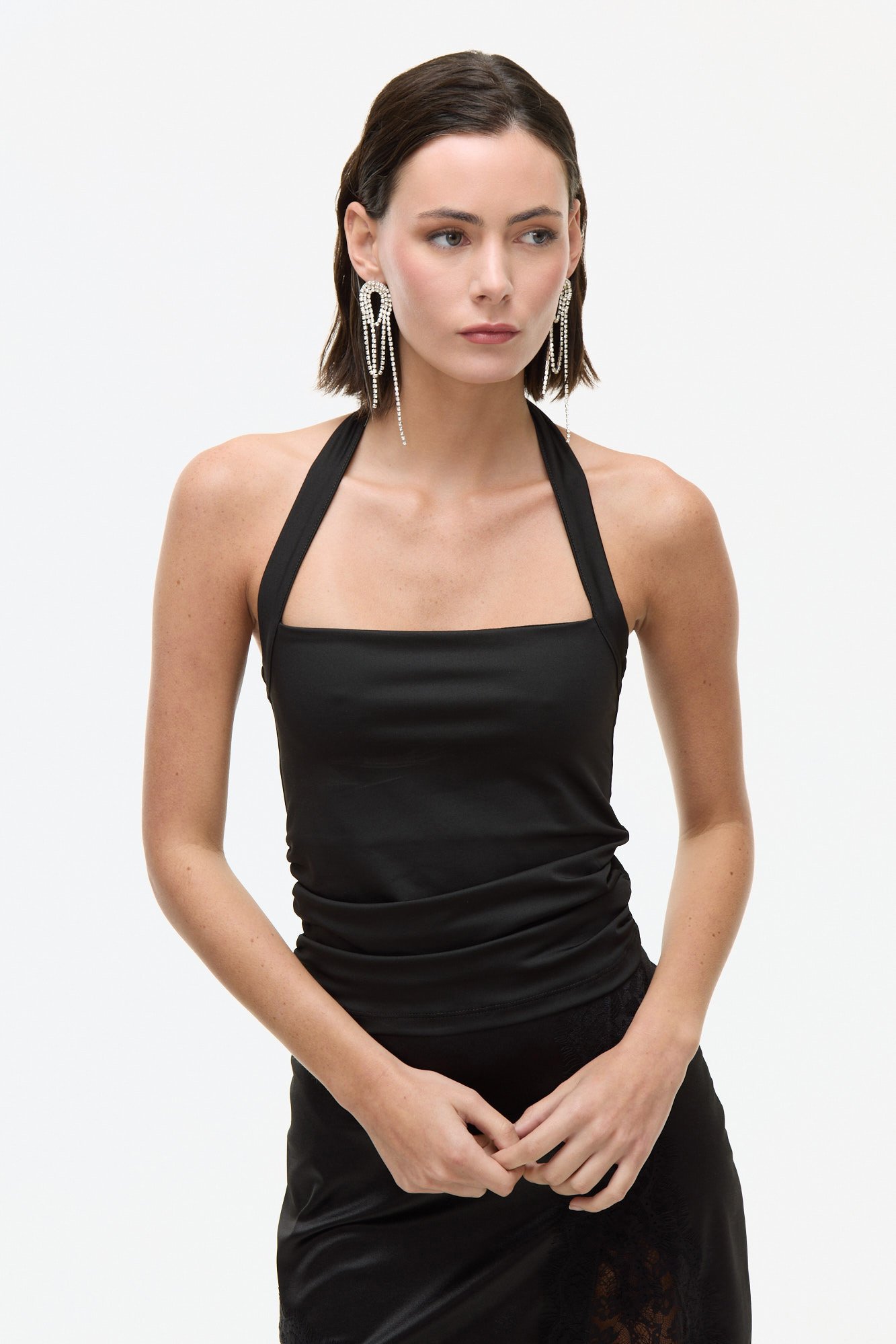 TOP HALTER CON ESCOTE RECTO, FRUNCE LATERAL Y AJUSTE ELÁSTICO QUE ACOMPAÑA LA SILUETA. TEXTURA SUAVE Y LIGERAMENTE ELÁSTICA.