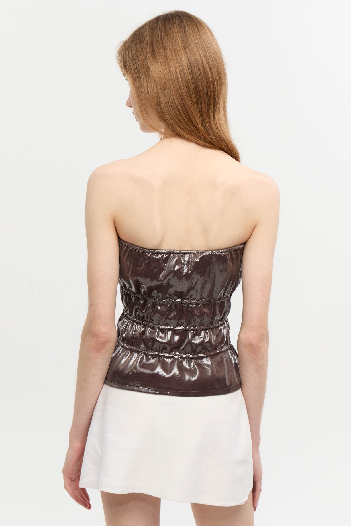 Top strapless confeccionado en seda con lurex. Largo a la primera cadera. Con jaretas horizontales y tiras finas para atar que permiten el ajuste al cuerpo. Lleva forrería de algodón.