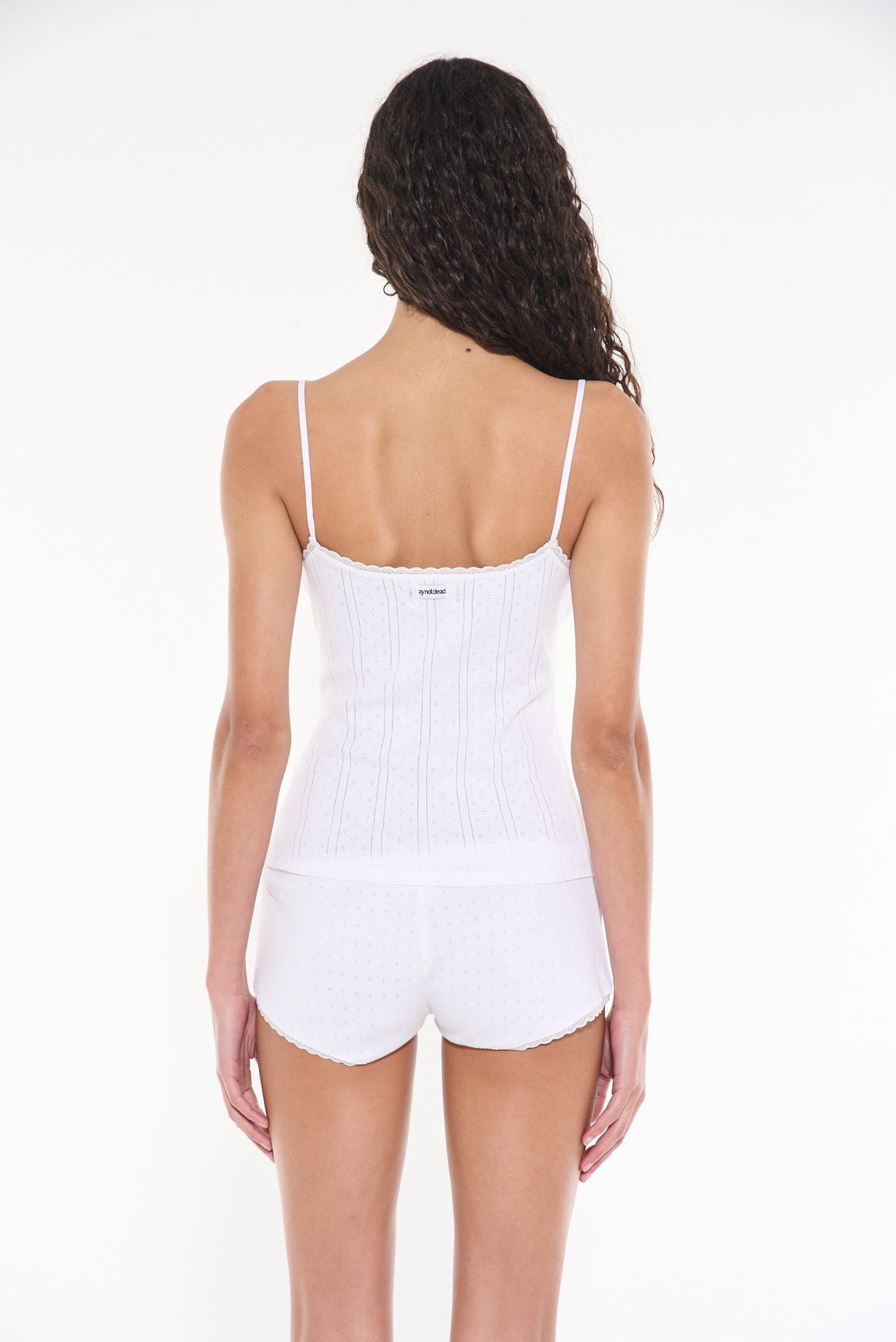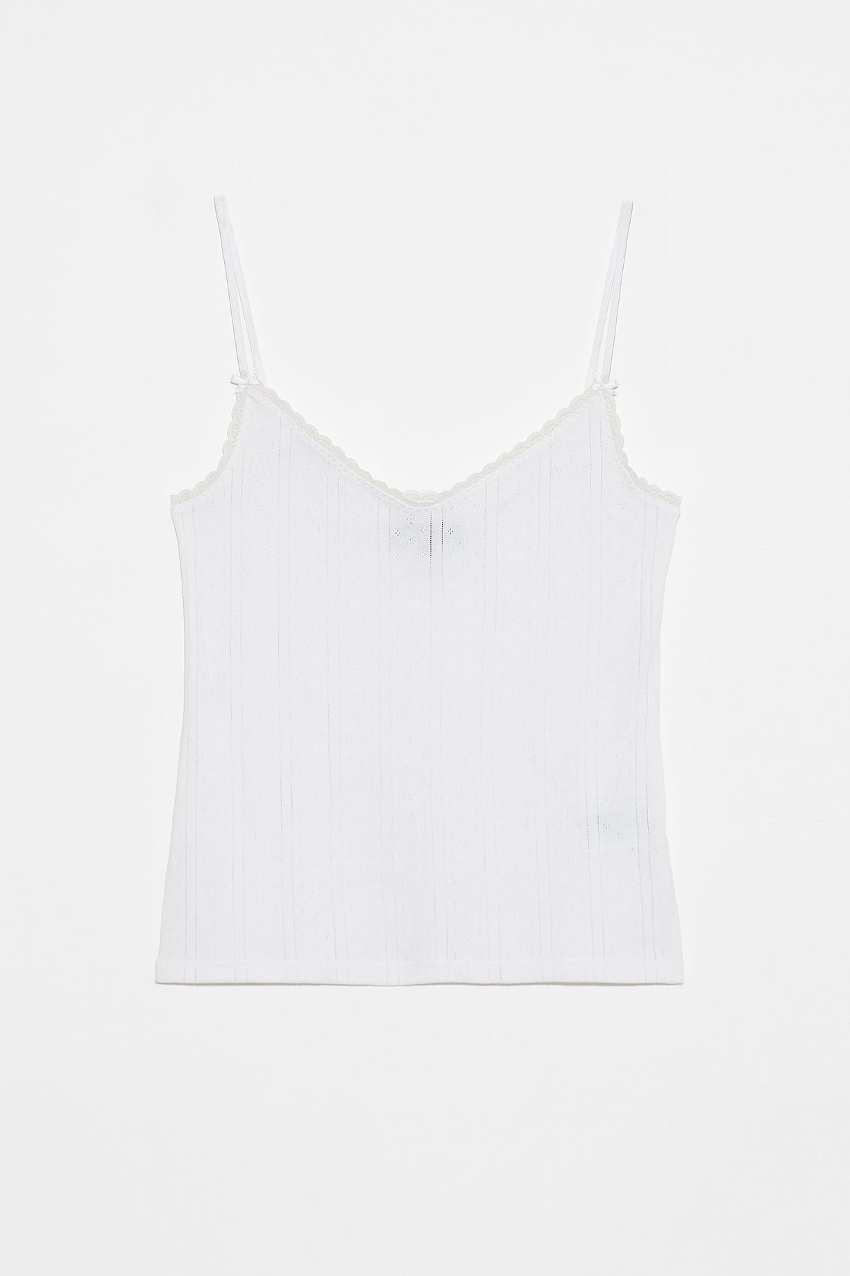 Top musculosa en jersey desagujado, tipo ‘pointelle’. De calce al cuerpo y largo a la cadera, con detalle de puntilla de encaje en escote.