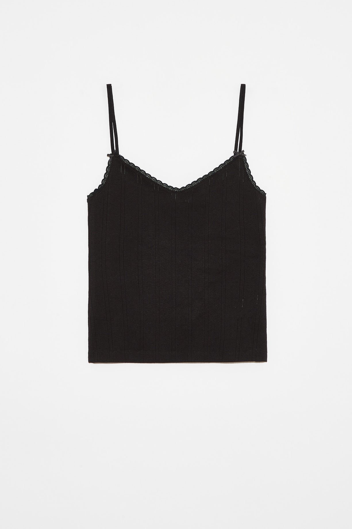Top musculosa en jersey desagujado, tipo ‘pointelle’. De calce al cuerpo y largo a la cadera, con detalle de puntilla de encaje en escote.