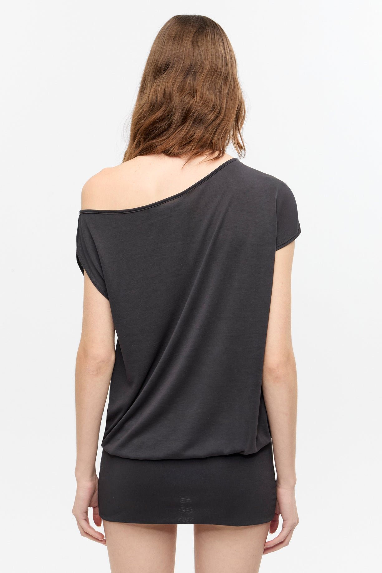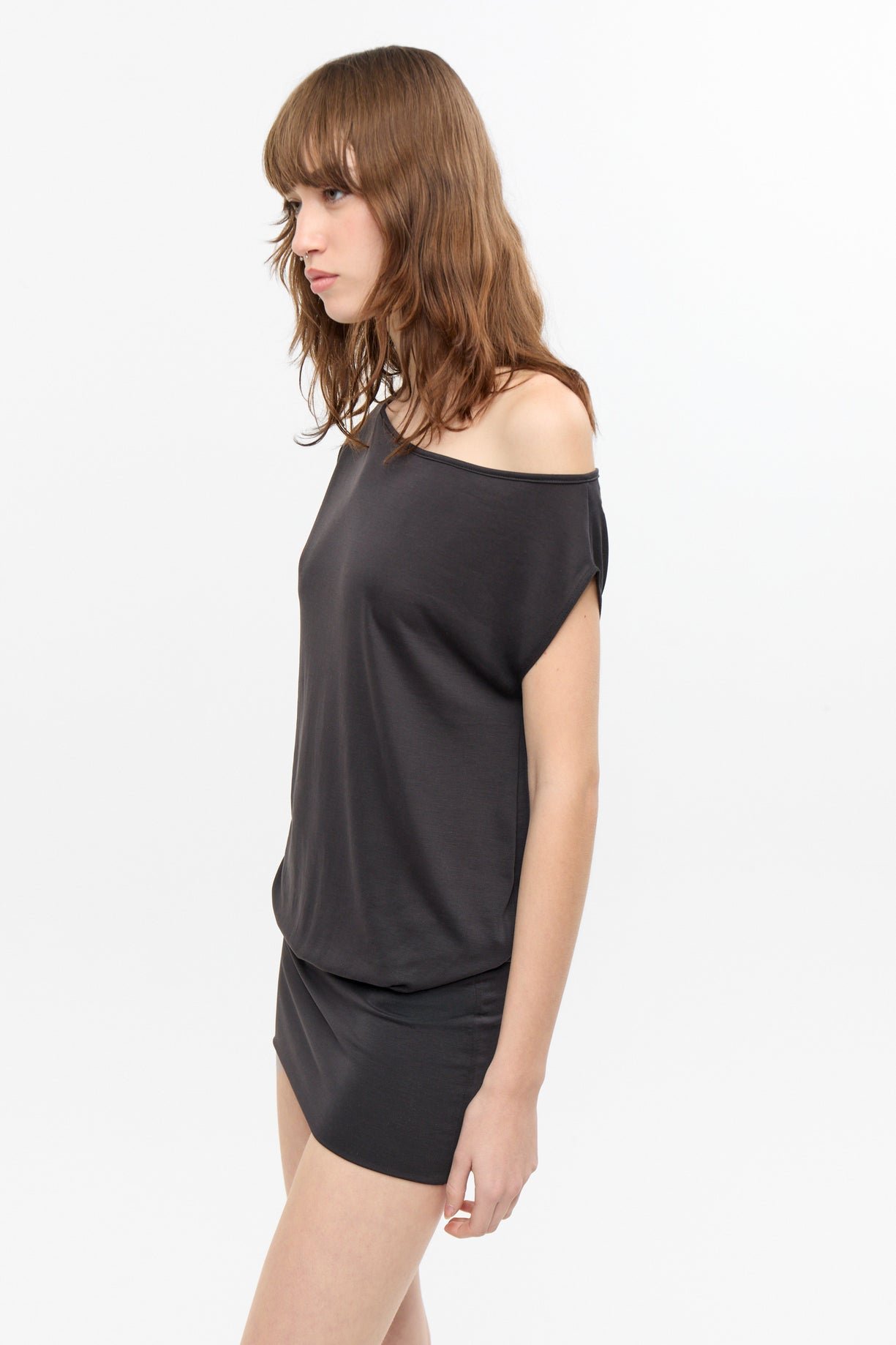 Vestido corto confeccionado en modal con efecto peach. De mangas cortas, escote asimétrico, calce holgado en la zona superior y recorte fitted en la inferior.