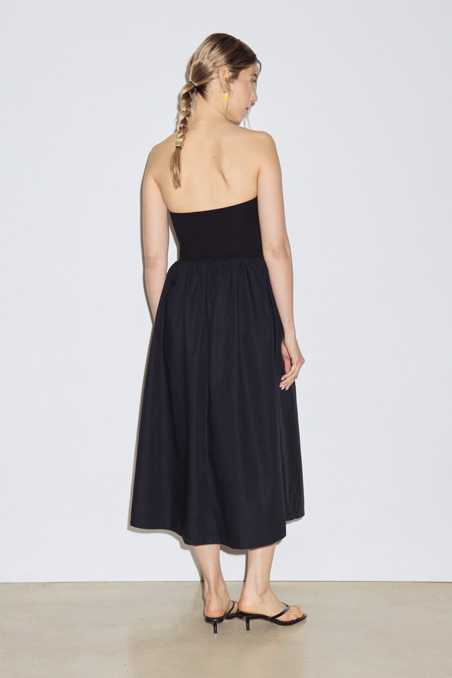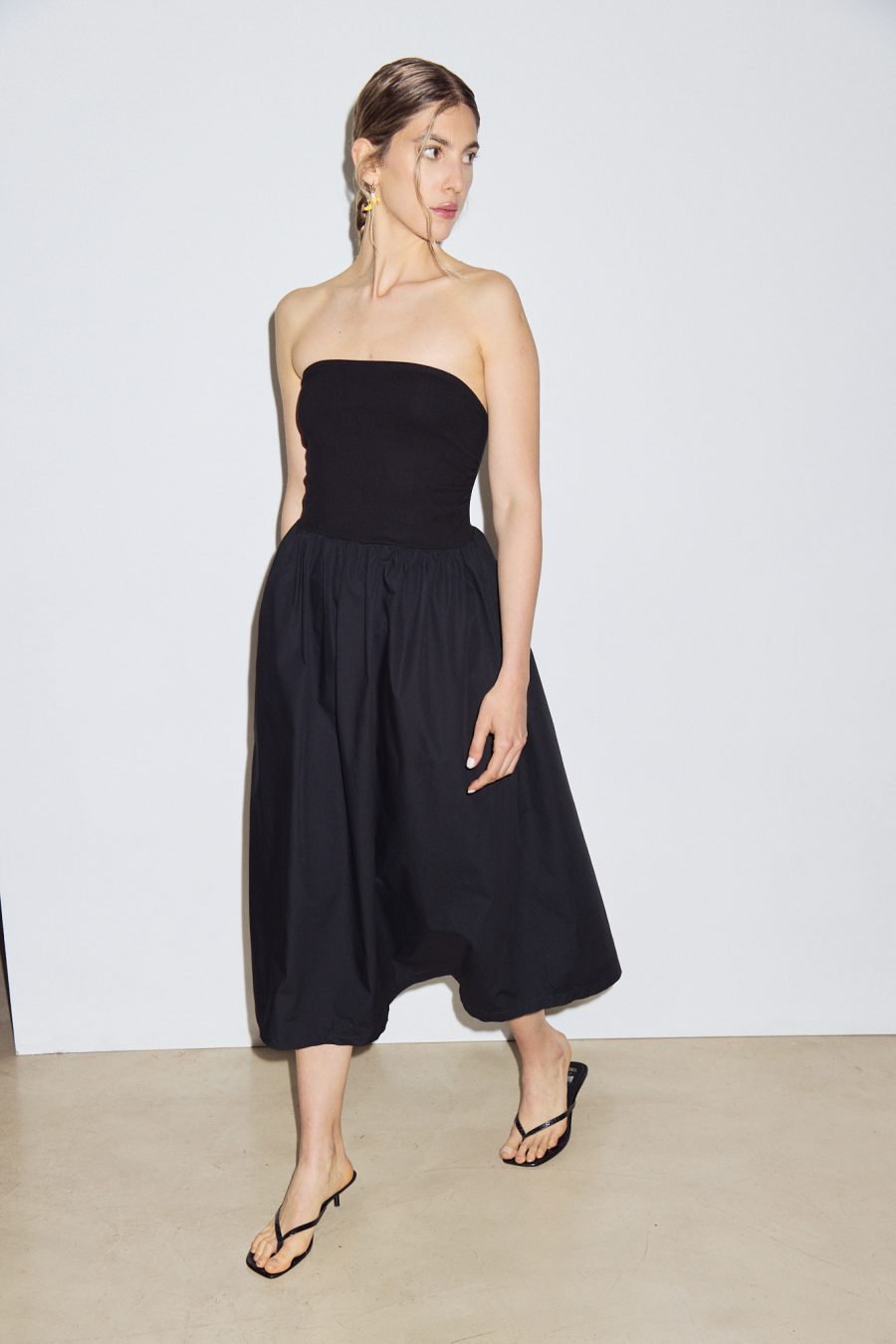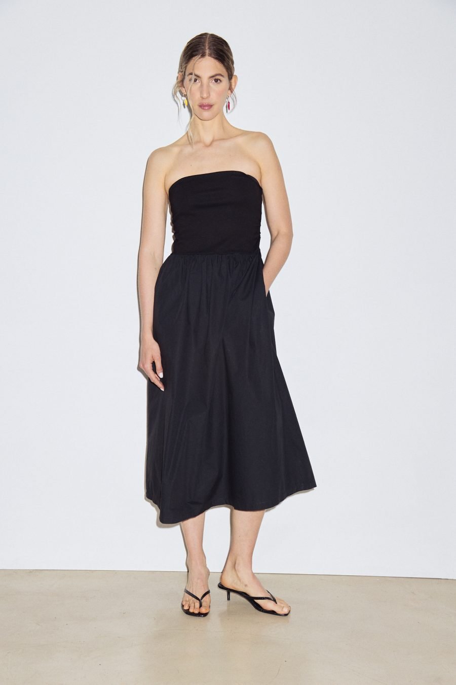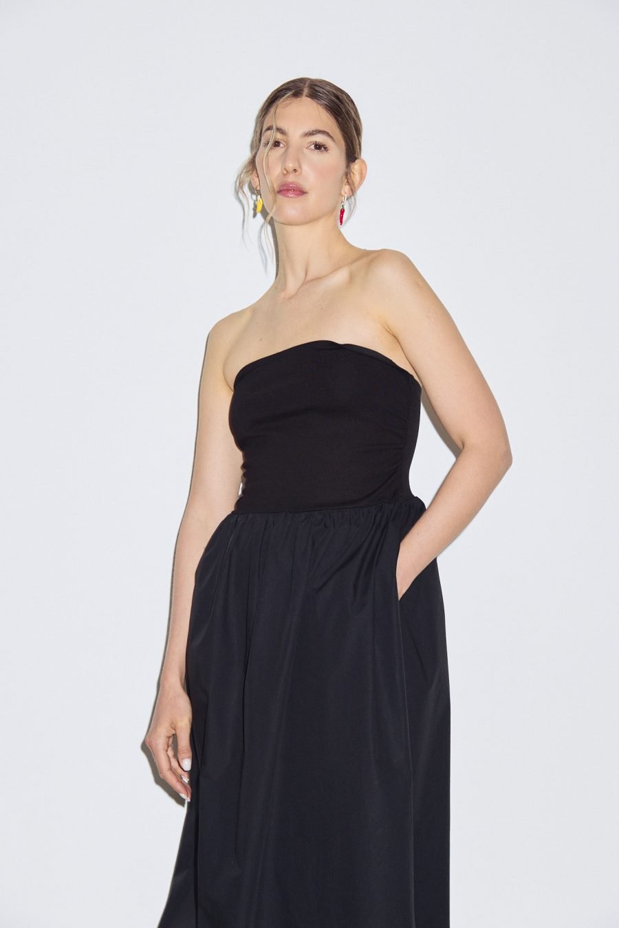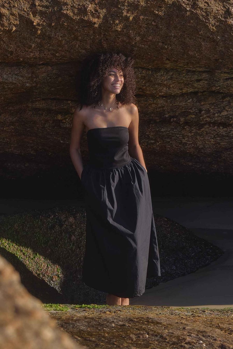 Vestido strapless de largo midi. Una bomba que necesitás en el armario para cualquier situación. Tiene una combinacion de telas, la parte superior está confeccionada en rayón con spandex y la falda en algodón con cuerpo (tiene bolsillos!!).